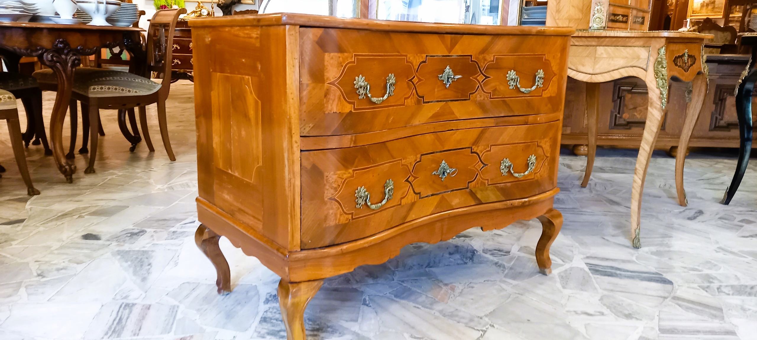 Комод рококо, южногерманская территория, середина XVIII века, периода переход от барокко к рококу. Твердый орех и шпон хвойных пород. Богатая инкрустация с березы, болотного дуба, сливы и чечотской березы. Изогнутое основание с резными ногами в виде копыт. Оригинальные замки и красивые рококо оригинальные фитинги.