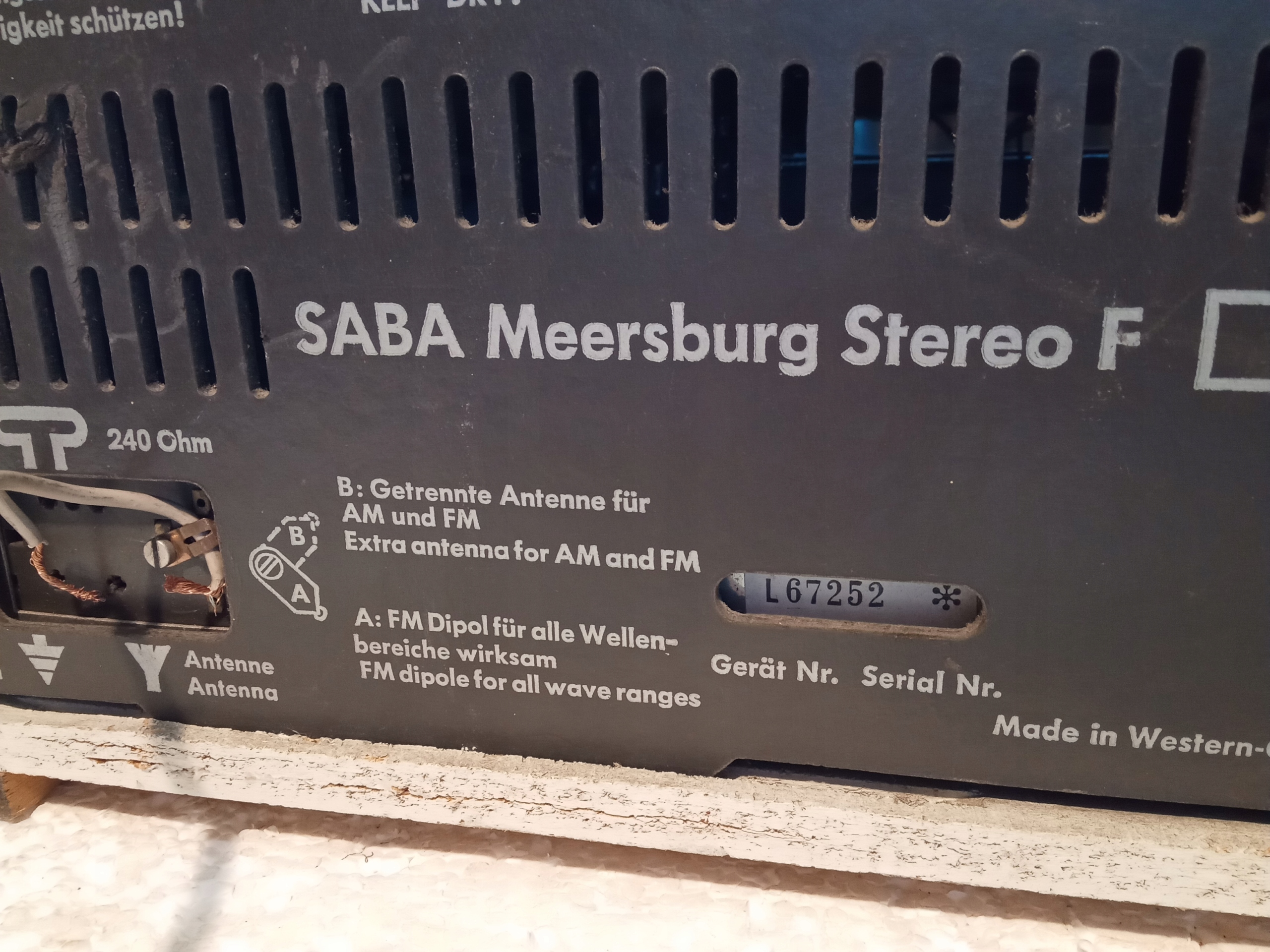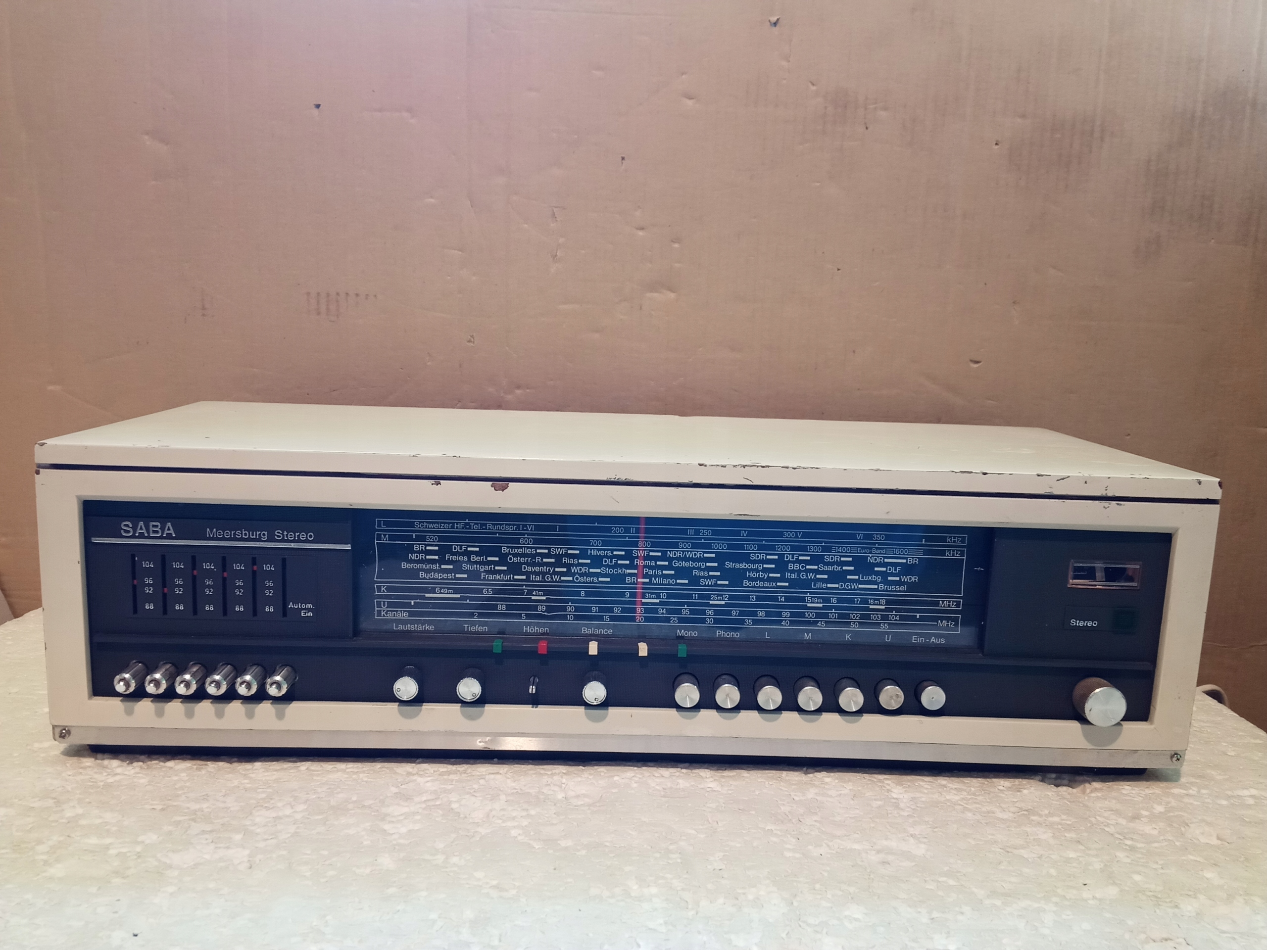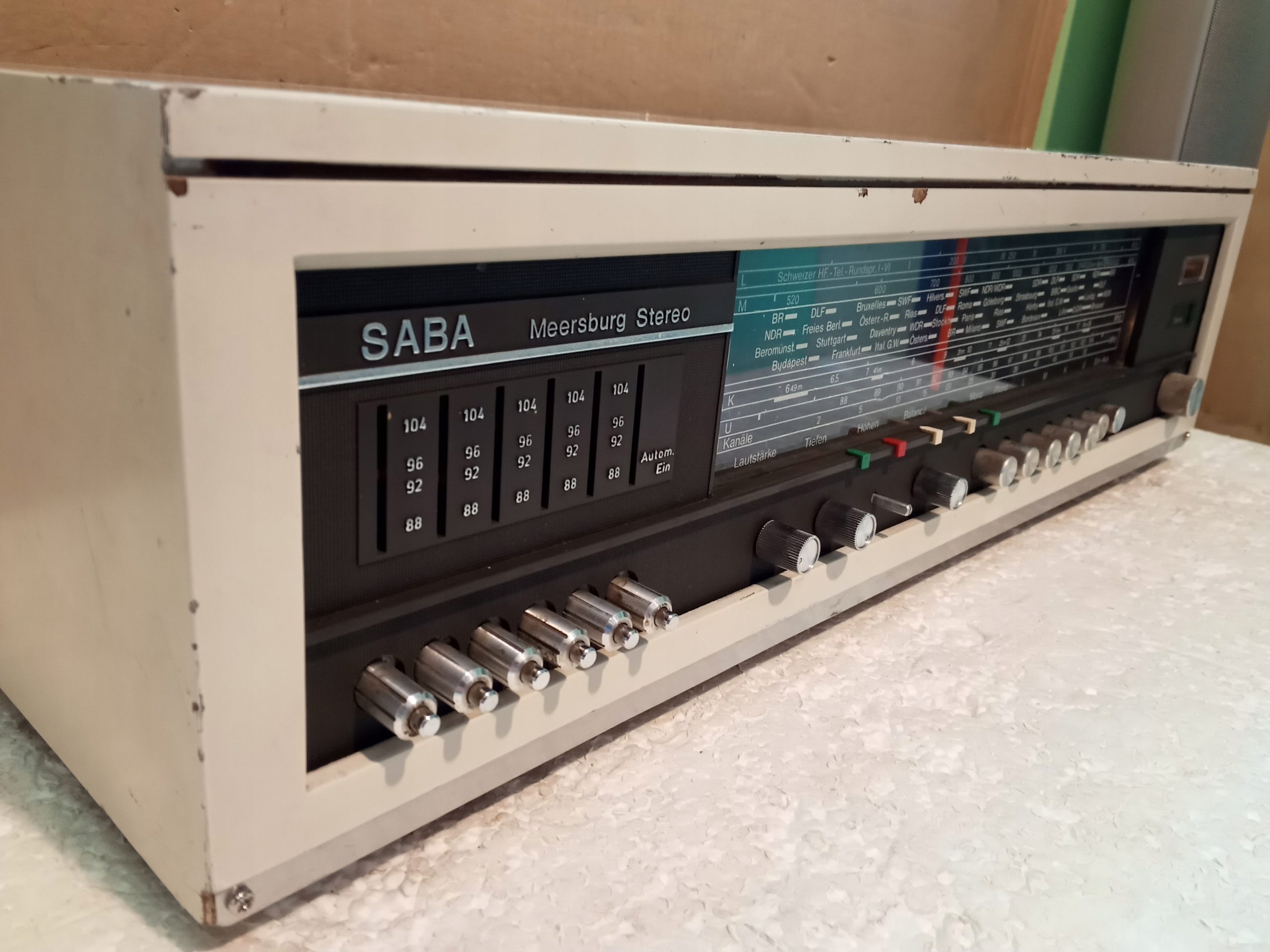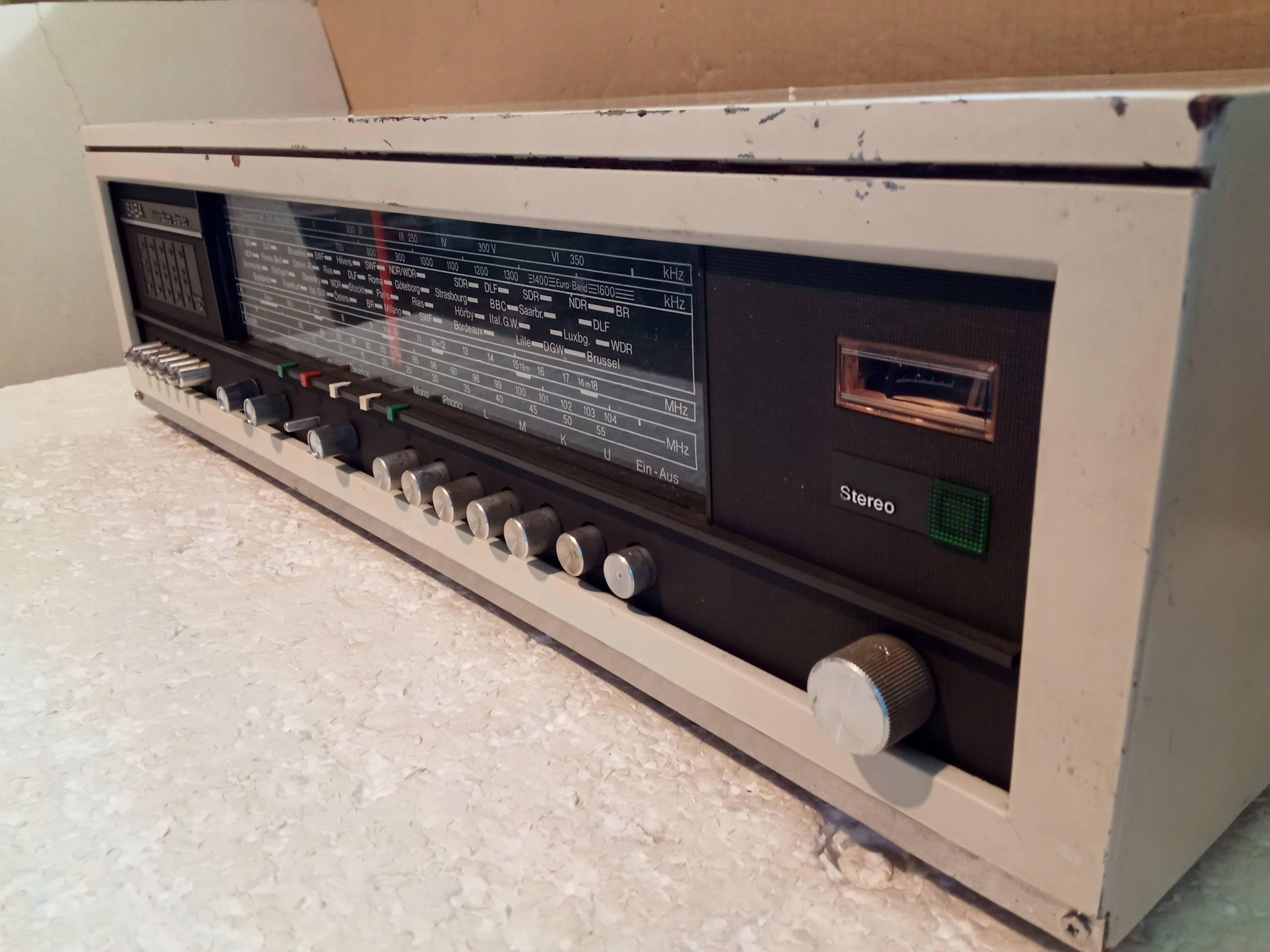 Amplituner Vintage : SABA Meersburg Stereo . Podświetlenie nie sprawne . Radio odbiera a funkcje są sprawne , brakuje jednej nasadki gałki !Całość gra ładnie . Wymiary : 560 x 160 x 210 mm . Waga : 6Kg .
