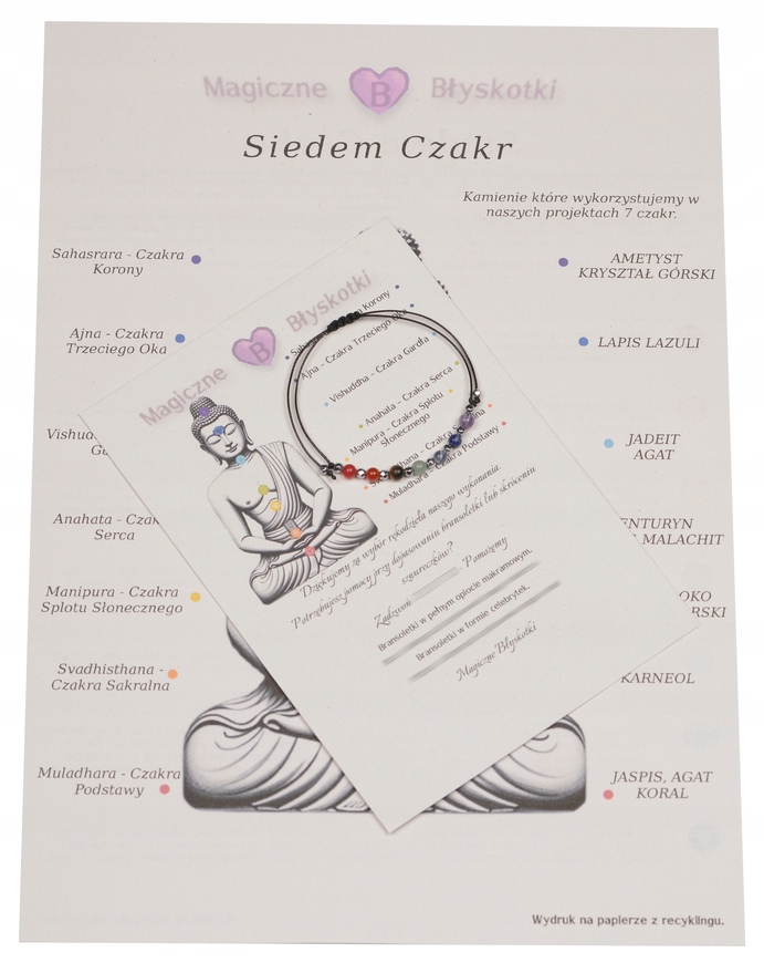 W komplecie otrzymujesz: bransoletkę, opis kamieni i kopertę jako opakowanie, co czyni ten zestaw unikalnym upominkiem.