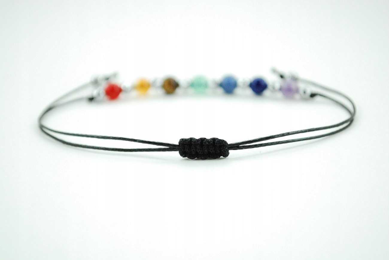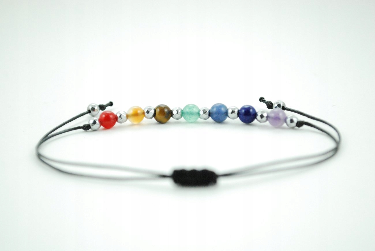 Jako przekładki między czakrami zastosowane są koraliki hematytowe, które też są na końcach sznureczków.