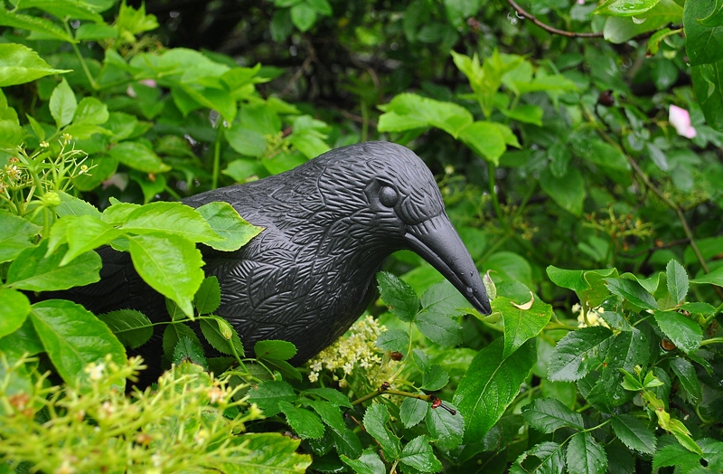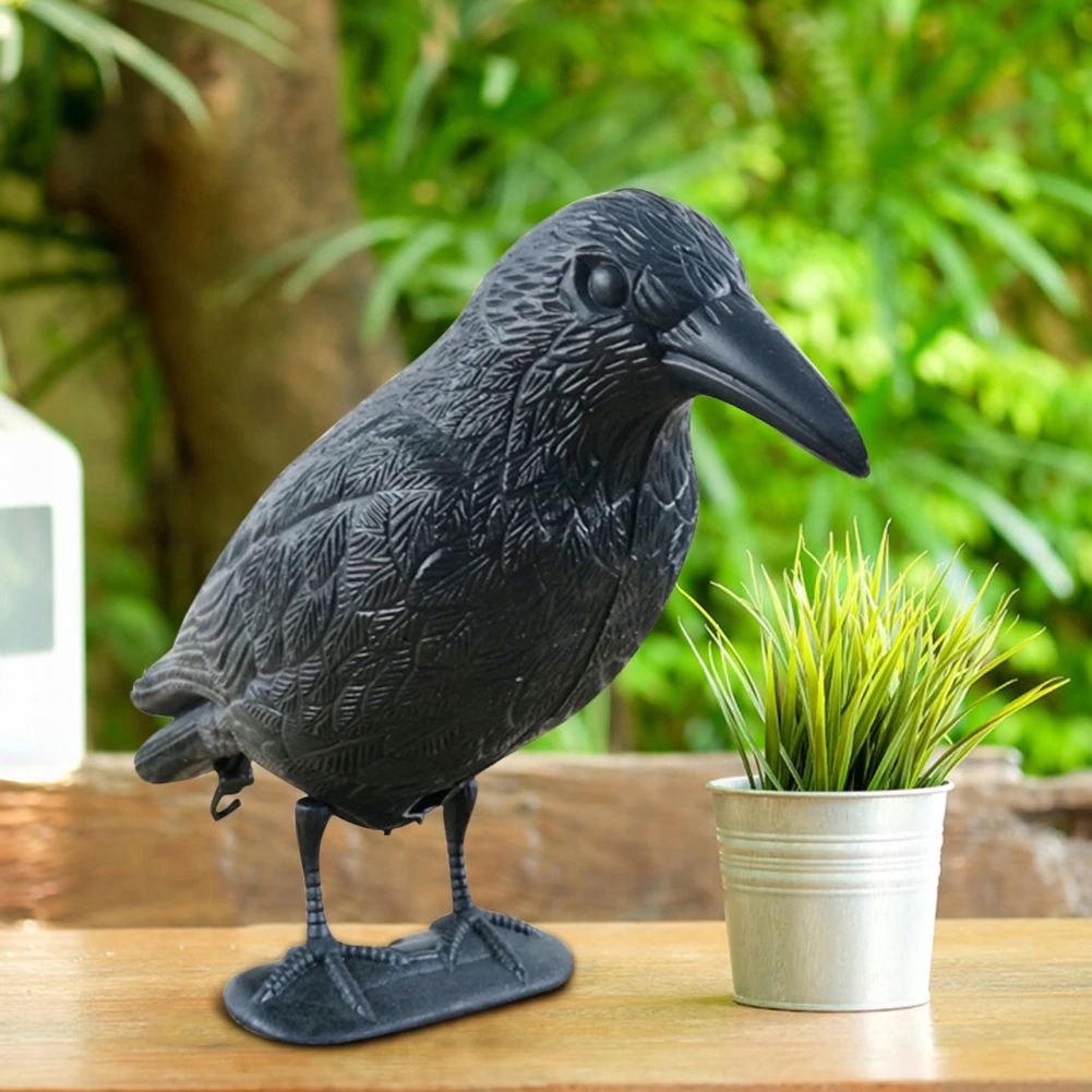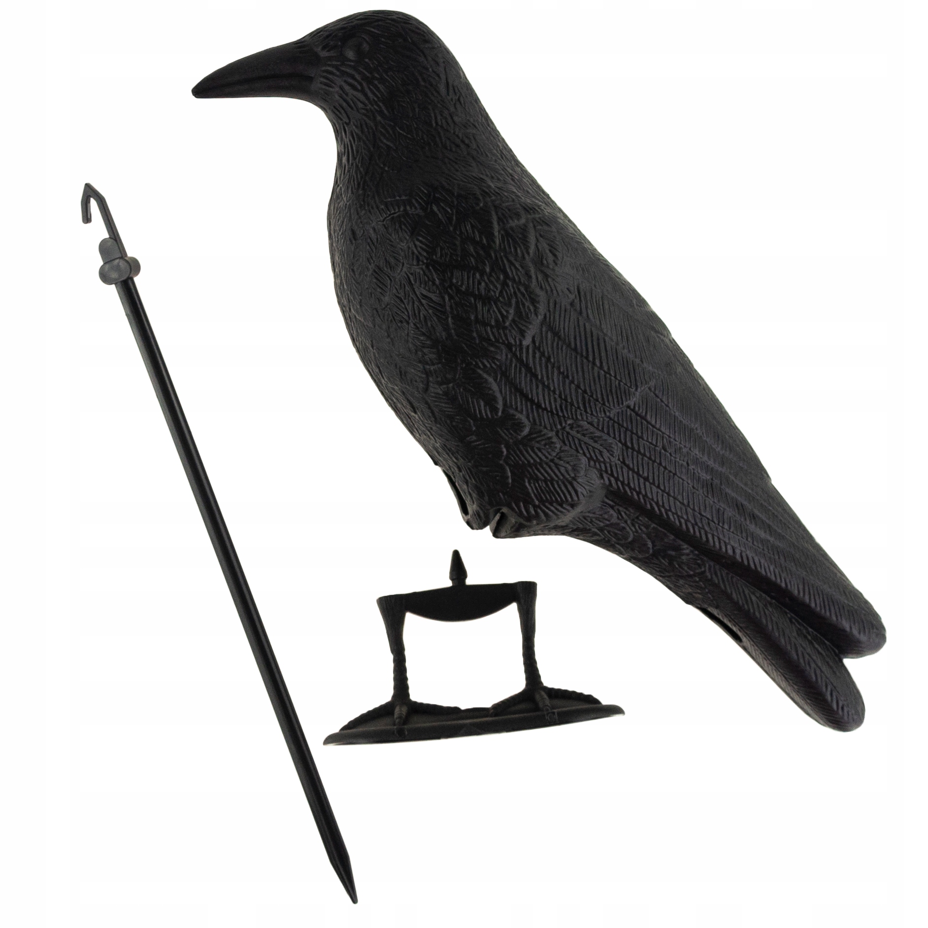 ✅ Sztuczny kruk o realistycznym wyglądzie i rozmiarze, pełniący rolę odstraszacza ptaków (gołębi, szpaków itp.) żerujących na działce lub w ogrodzie.
