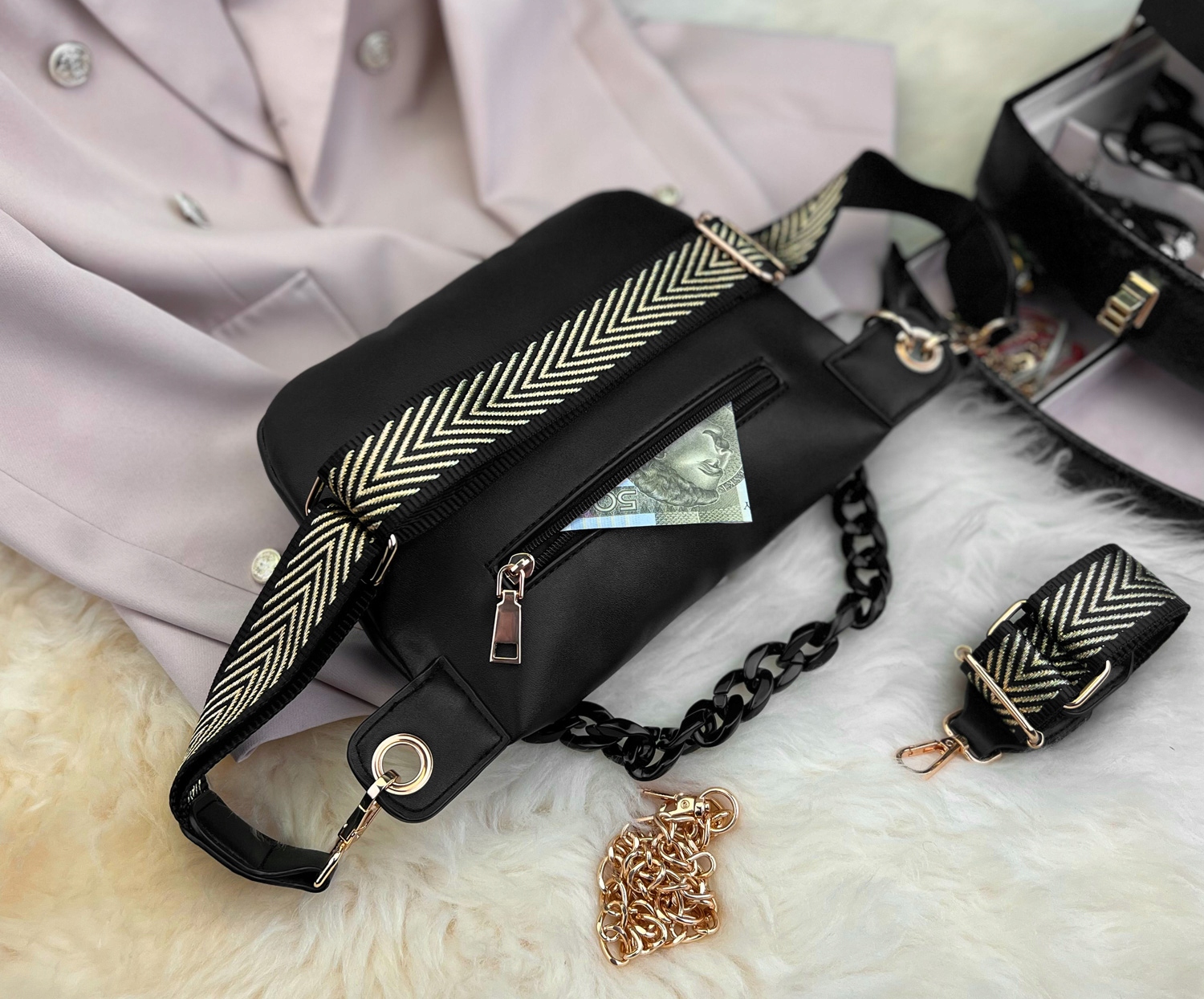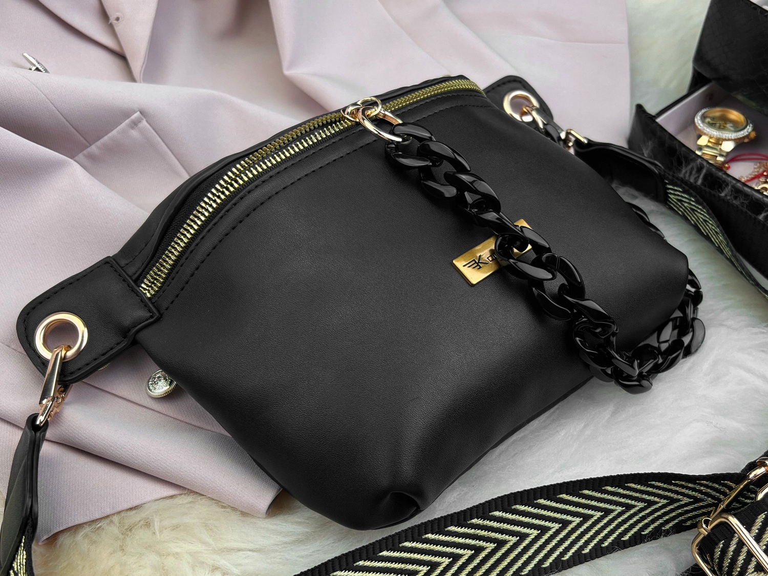 Nerka z mega wygodnym zamkiem, zakończona poręcznym łańcuchem. Dzięki zamykaniu na zamek, przy pomocy wygodnego łańcucha, otwieranie i zamykanie saszetki jest intuicyjne i bardzo, bardzo wygodne. Sam łańcuch prezentuje się niezwykle oryginalnie i elegancko. Dopełnieniem zaś jest zaś czarno-złoty, doczepiany pasek we wzór jodełki, wykonany z wysokiej jakości, mocnego polyestru.