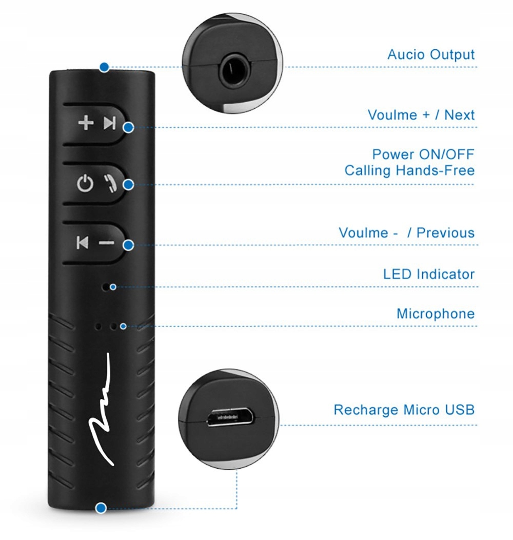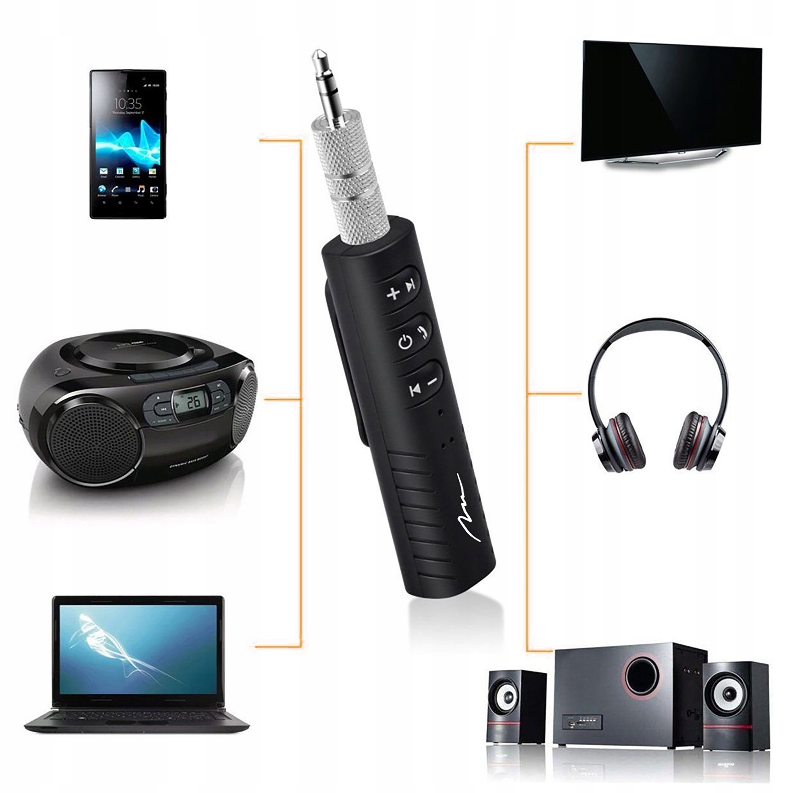 Szerokie zastosowanie Odbiornik MT3588 jest przeznaczony do odbioru dźwięku ze smartfonów i innych urządzeń obsługujących technologię Bluetooth. Prosta obsługa Wystarczy podłączyć urządzenie do AUX i sparować ze smartfonem lub innym bezprzewodowym źródłem dźwięku. Przyciski na obudowie ułatwiają odbierania połączeń, regulacje głośności i sterowania mediami. Car Audio MT3588 to bezprzewodowy odbiornik Bluetooth do każdego systemu Car Audio wyposażonego w gniazdo AUX. Słuchaj swojej ulubionej muzyki ze smartfona w trakcie podróży! Słuchawki kablowe Zamień swoje zwykłe słuchawki ze złączem Jack 3,5mm w zaawansowane, bezprzewodowe słuchawki Bluetooth. Brak gniazda AUX w Twoim najnowszym smartfonie nie stanowi już problemu! Zestaw głośnomówiący Odbiornik MT3588 po podłączeniu do systemu Car Audio Twojego samochodu umożliwia bezpieczne prowadzenie rozmów telefonicznych w czasie trwania podróży. Domowy zestaw Hi-Fi Podłącz bezprzewodowy odbiornik MT3588 do swojego domowego zestawu Hi-Fi i dodaj do niego funkcję Bluetooth.