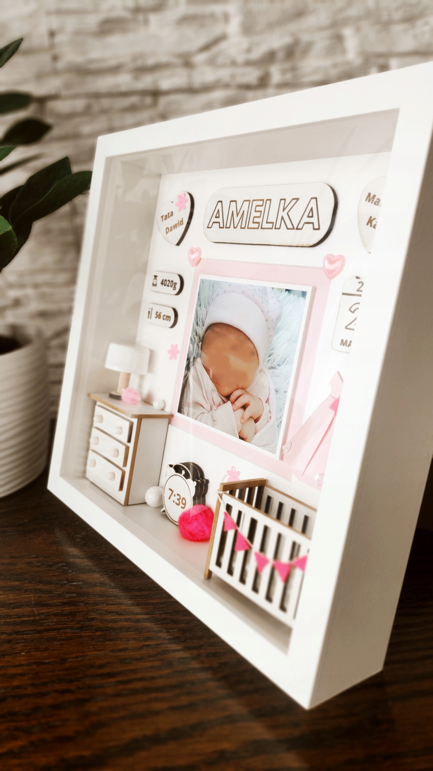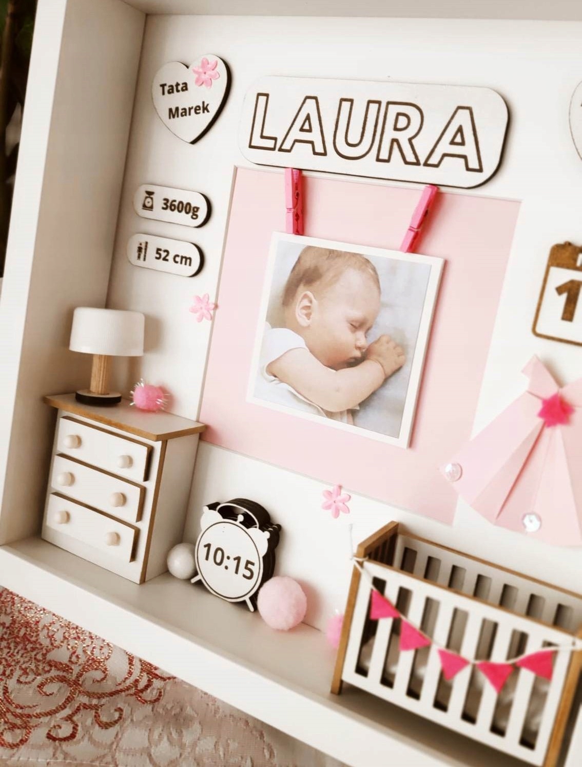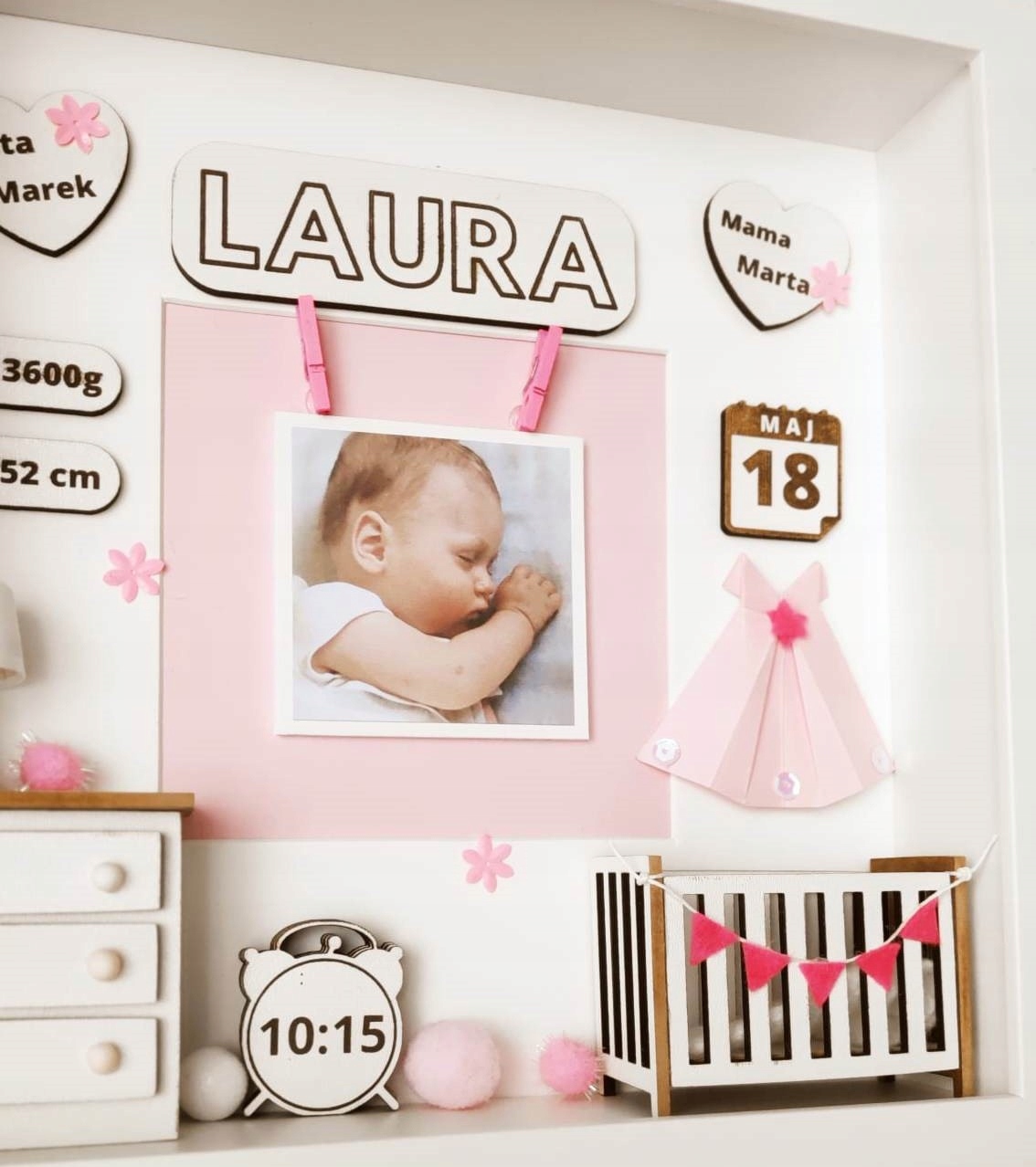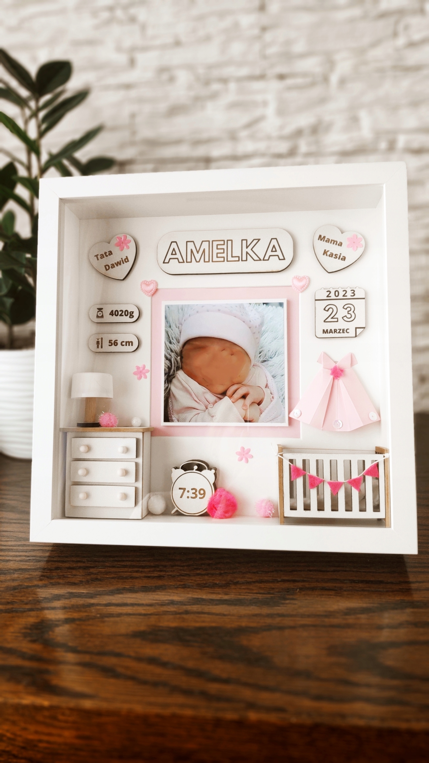 ❤️ Metryczka na każde urodziny dziecka to wyjątkowa pamiątka na całe życie dla niego i jego rodziców. Wyjątkowy i niepowtarzalny pomysł na prezent. Wykonana jako rękodzieło w białej ramce z dodatkami jak na zdjęciu tworzy efekt 3 D. Ramkę można postawić na meblu (ma swoją stopkę) lub powiesić na ścianie. Użyte kolory to niebieskie dla chłopca a różowe dla dziewczynki. Na życzenie możemy zmienić kolorystykę według przesłanych wytycznych.