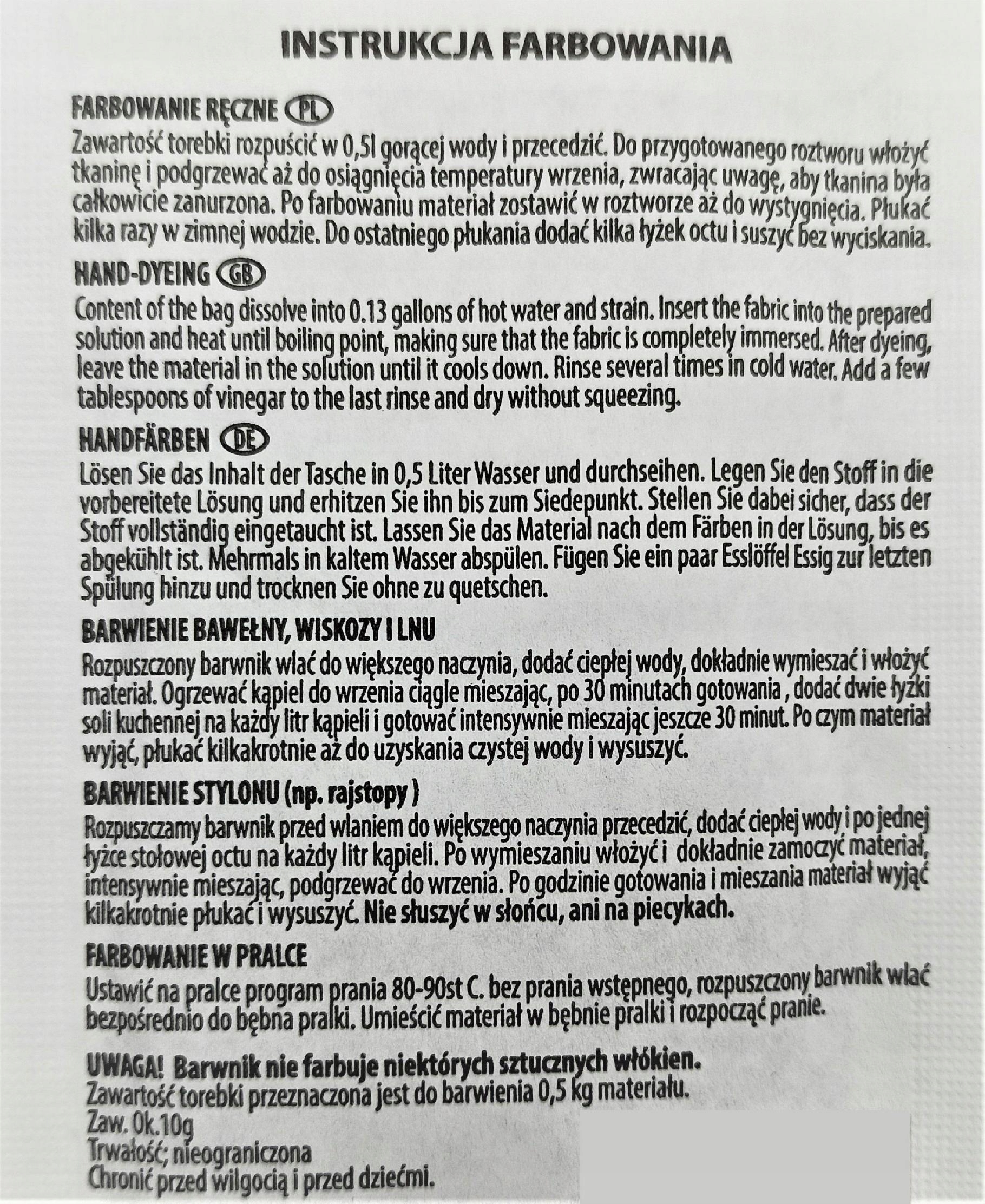 Przechowywanie: Barwnik należy przechowywać w suchym i chłodnym miejscu, z dala od bezpośredniego światła słonecznego. Trzymać z dala od dzieci i zwierząt.