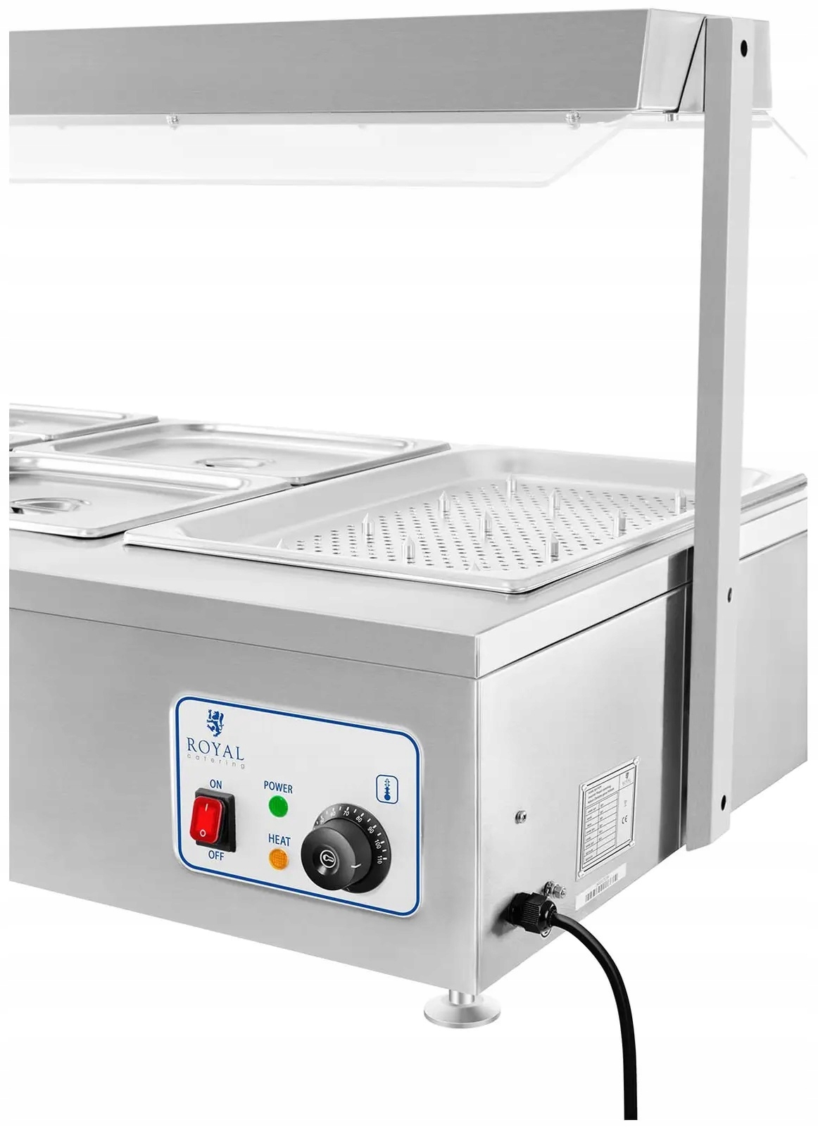 Dysponuje elementem grzewczym, a także lampą halogenową służącymi do podgrzewania na sucho i utrzymywania temperatury zup, sosów, ryżu, mięs, ziemniaków, wędlin, gulaszów itp. Produkt wyposażony w 6 pojemników GN świetnie spisuje m.in. w hotelach, barach szybkiej obsługi, restauracjach, kantynach, bufetach, a także podczas kolonii, obozów lub eventów