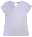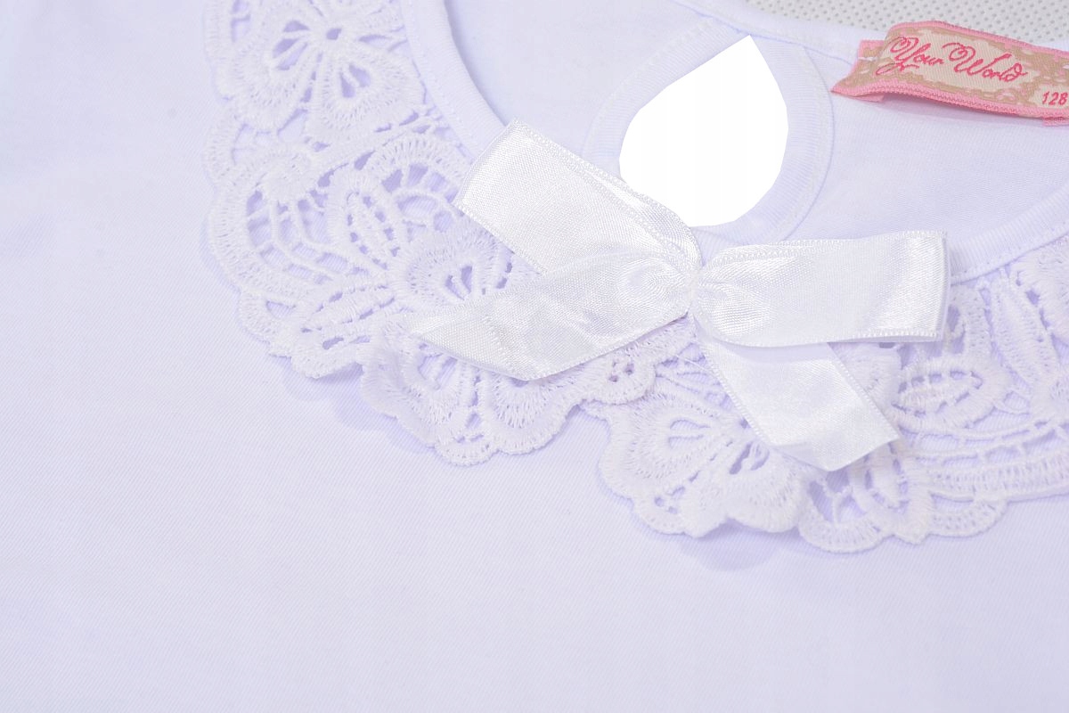 Krój: elegancka bluzeczka z krótkim rękawkiem, z koronkowym kołnierzykiem i satynową kokardką pod szyją. Na karku ozdobna łezka.
