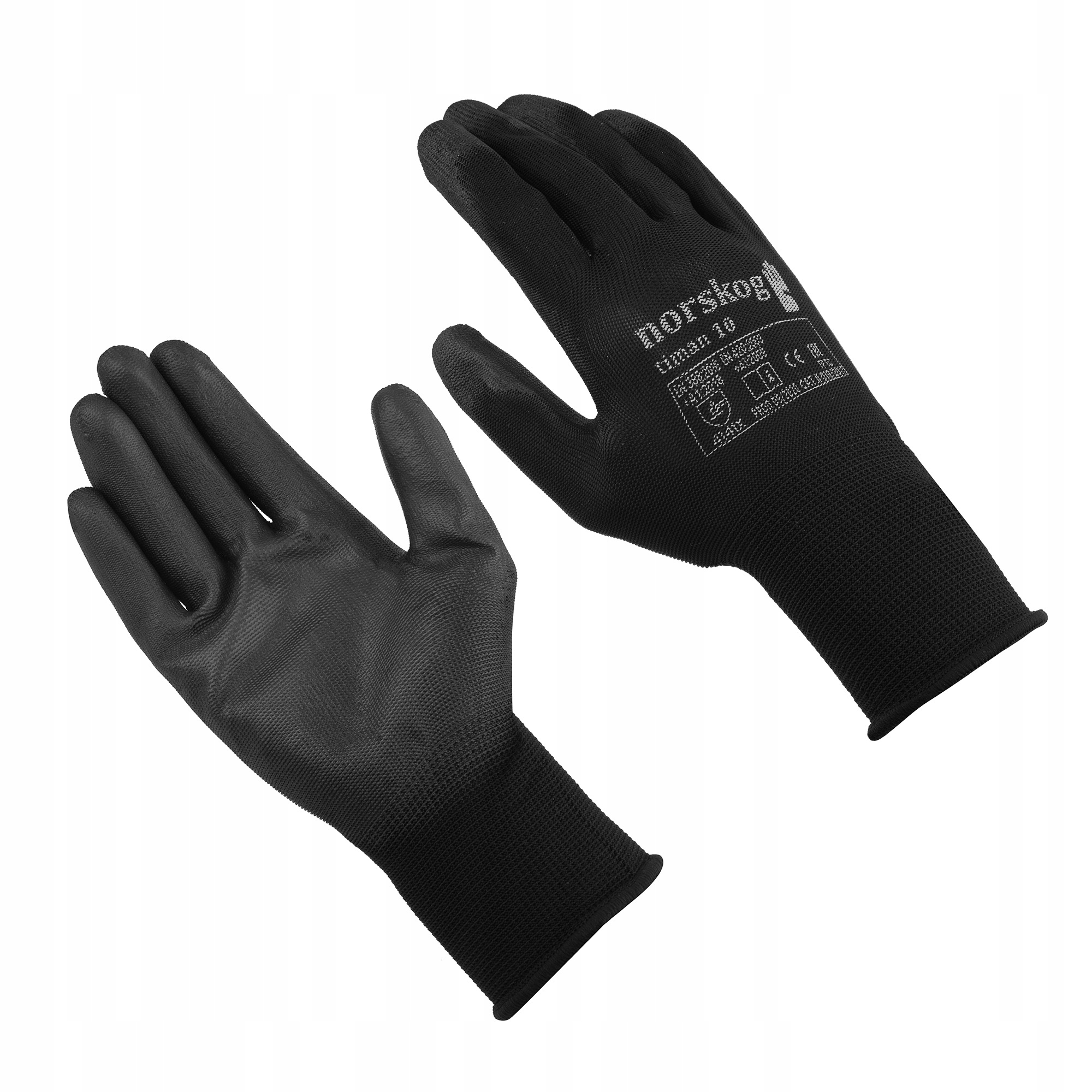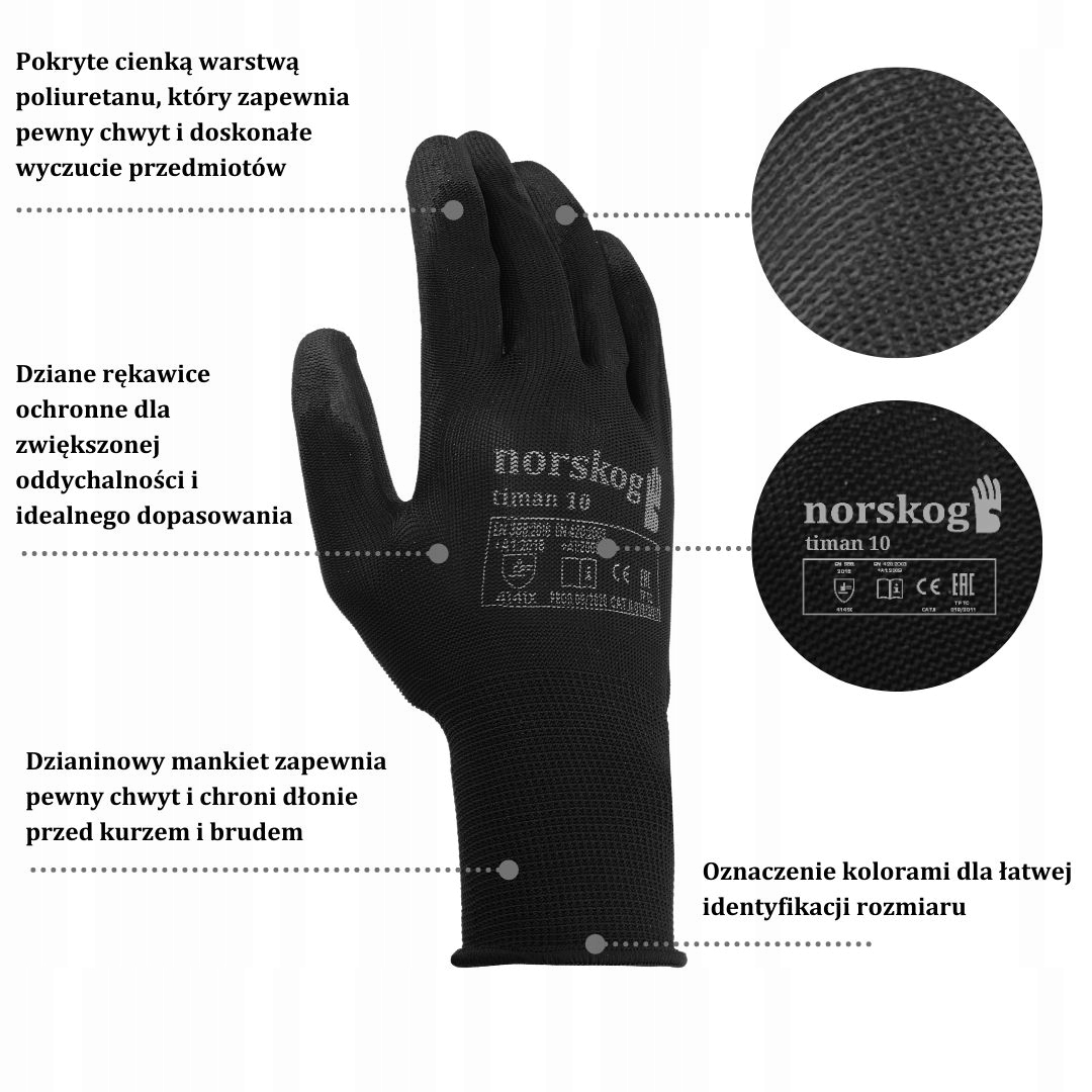 Rękawice robocze Norskog Timan posiadają cienką, idealnie przylegającą do dłoni nylonową wkładkę w kolorze czarnym. Część chwytna powleczona jest porowatym, czarnym poliuretanem, który gwarantuje dobry chwyt oraz czucie trzymanych przedmiotów. Dzięki temu, że tylko część dłonicową pokryto poliuretanem, dłonie mogą swobodnie oddychać, co znacznie zwiększa komfort pracy. Rękawice zakończone są elastycznymi ściągaczami, które są przyjemne w dotyku oraz idealnie dopasowują się do kształtu nadgarstka, zapewniając pełen komfort pracy. Występują w rozmiarach 6-11, dzięki czemu możliwe jest dobre dopasowanie do dłoni, co znacznie ułatwia wykonywanie prac wymagających precyzji. Dodatkowo rękawice są odporne na ścierania, przecięcia, rozdarcia i przekłucia, co gwarantuje ich długą żywotność.