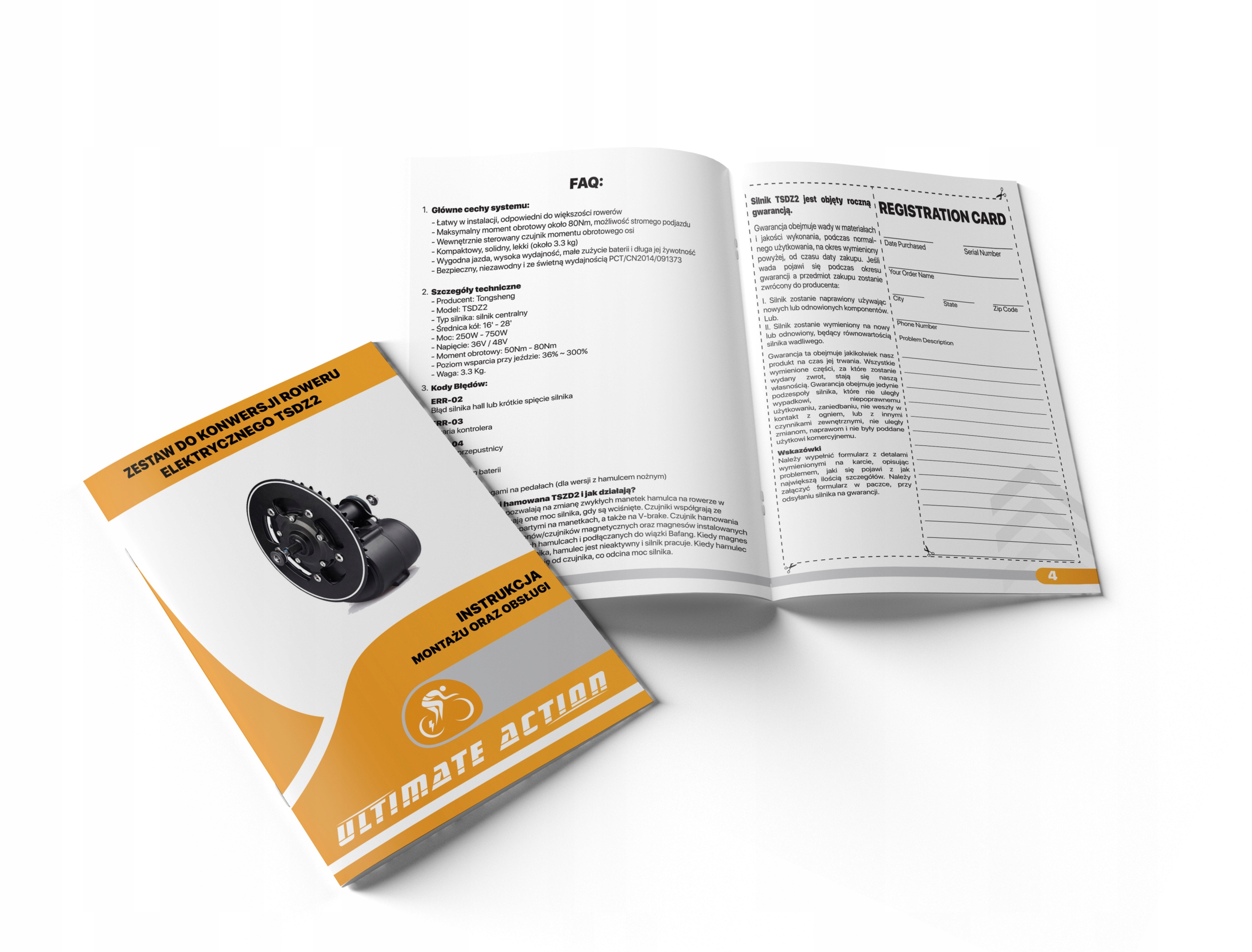 W zestawie znajdziesz Instrukcję, która zawiera główną informację na temat prawidłowego użytkowania, obsługi i instalacji zestawu elektrycznego TSZD2 (Tongsheng), wyświetlaczu oraz dodatkowych części.