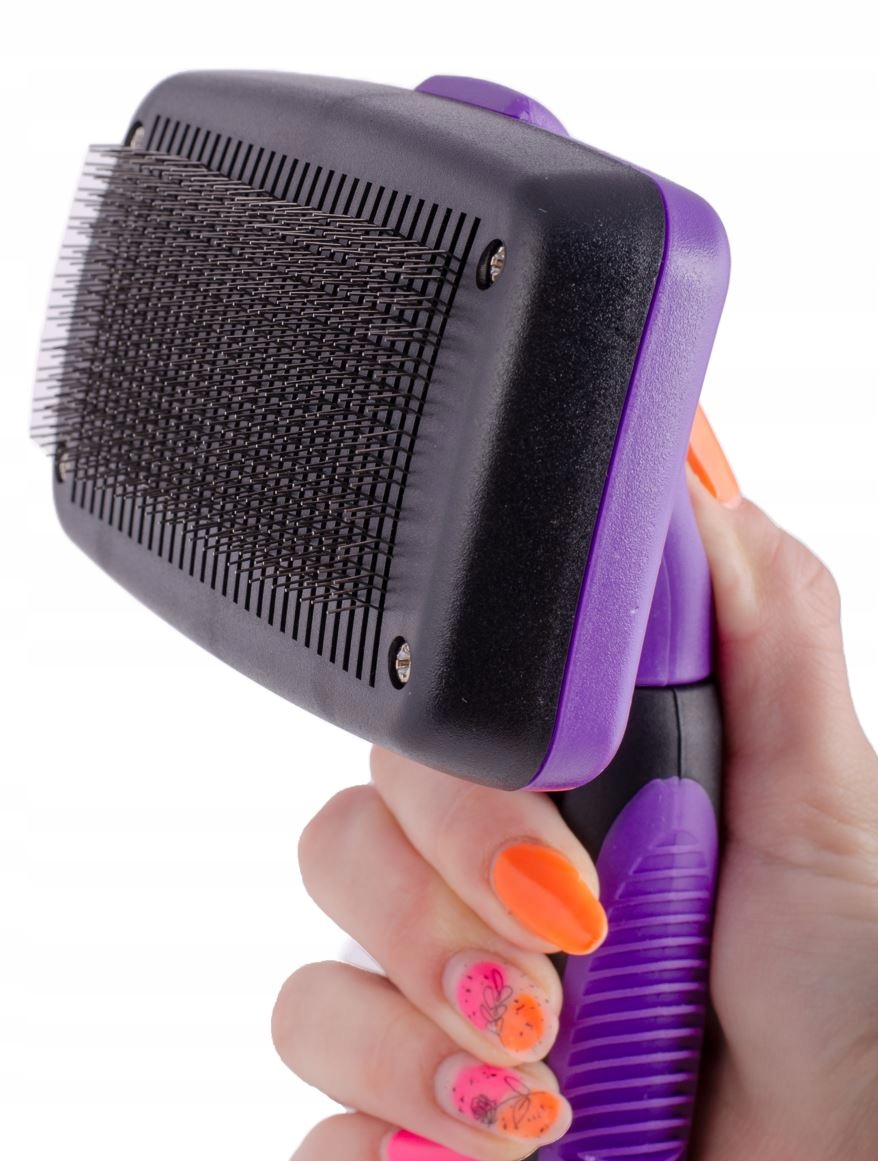 Koniec z wyciąganiem sierści i podszerstka spomiędzy ząbków. Wystarczy przycisnąć duży przycisk, który znajduje się na tylnej stronie szczotki. Po naciśnięciu przycisku sierść samoczynnie wysunie się ze szczotki a stalowe ząbki schowają się. Kliknij i schowaj je na stałe, aż do następnego użycia. To takie proste