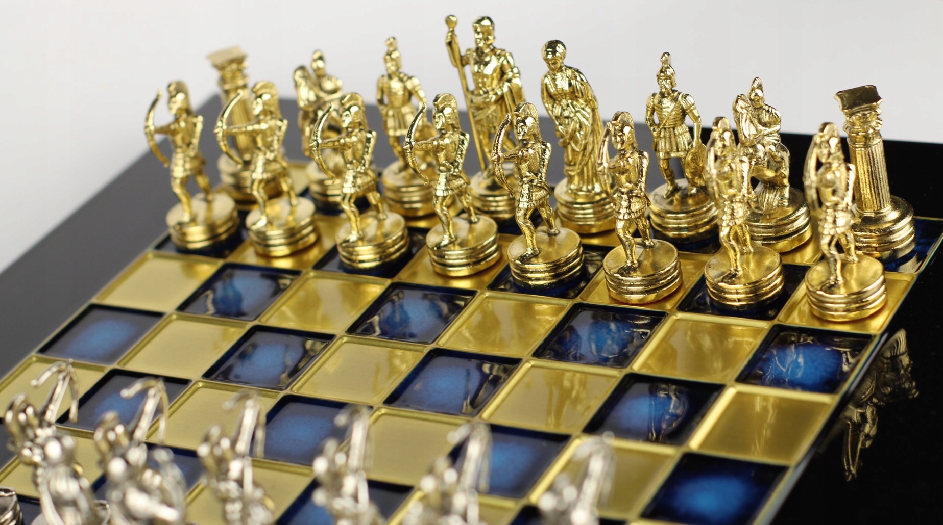 Archers czyli łucznicy. W starożytności i średniowieczu stanowili często zaporę nie do przejścia. Doskonali obrońcy twierdz i umocnień, na polu bitwy skutecznie przerzedzali szeregi wroga. Nasze szachy inspirowane są dzielnością łuczników - to piony. Druga linia to postacie bogów greckich - król i królowa, goniec i skoczek to rycerze. Wieża symbolizowana przez kolumnę nawiązuje do architektury starożytnej. Szachy i szachownica wykonane zostały z troską o zachowanie najwyższej jakości.