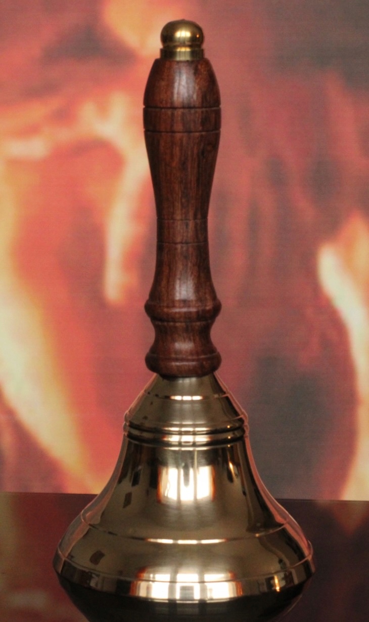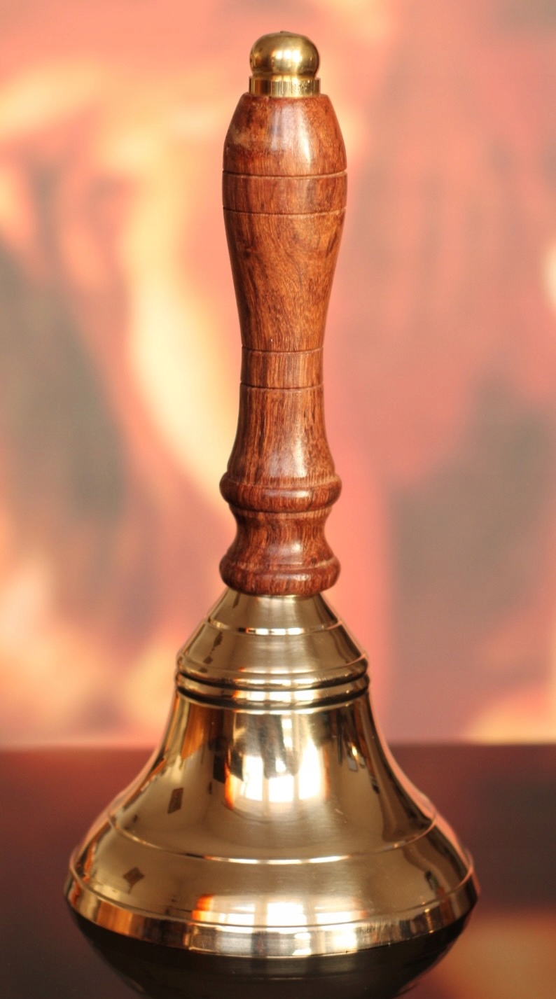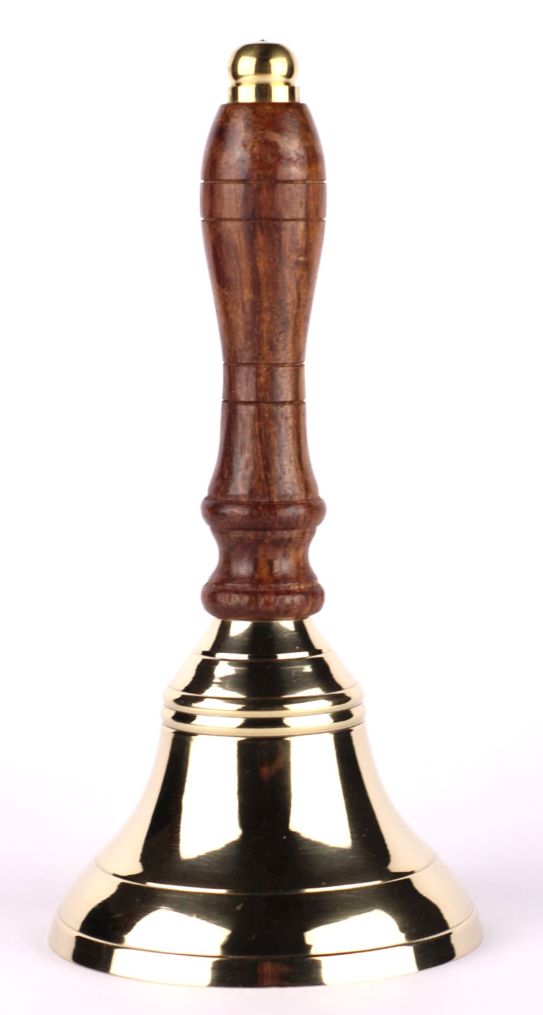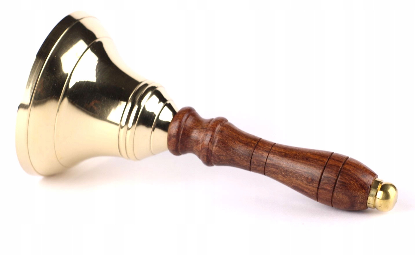 Dzwon dzwonek mosiężny z drewnianą rączką.