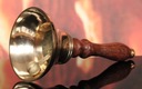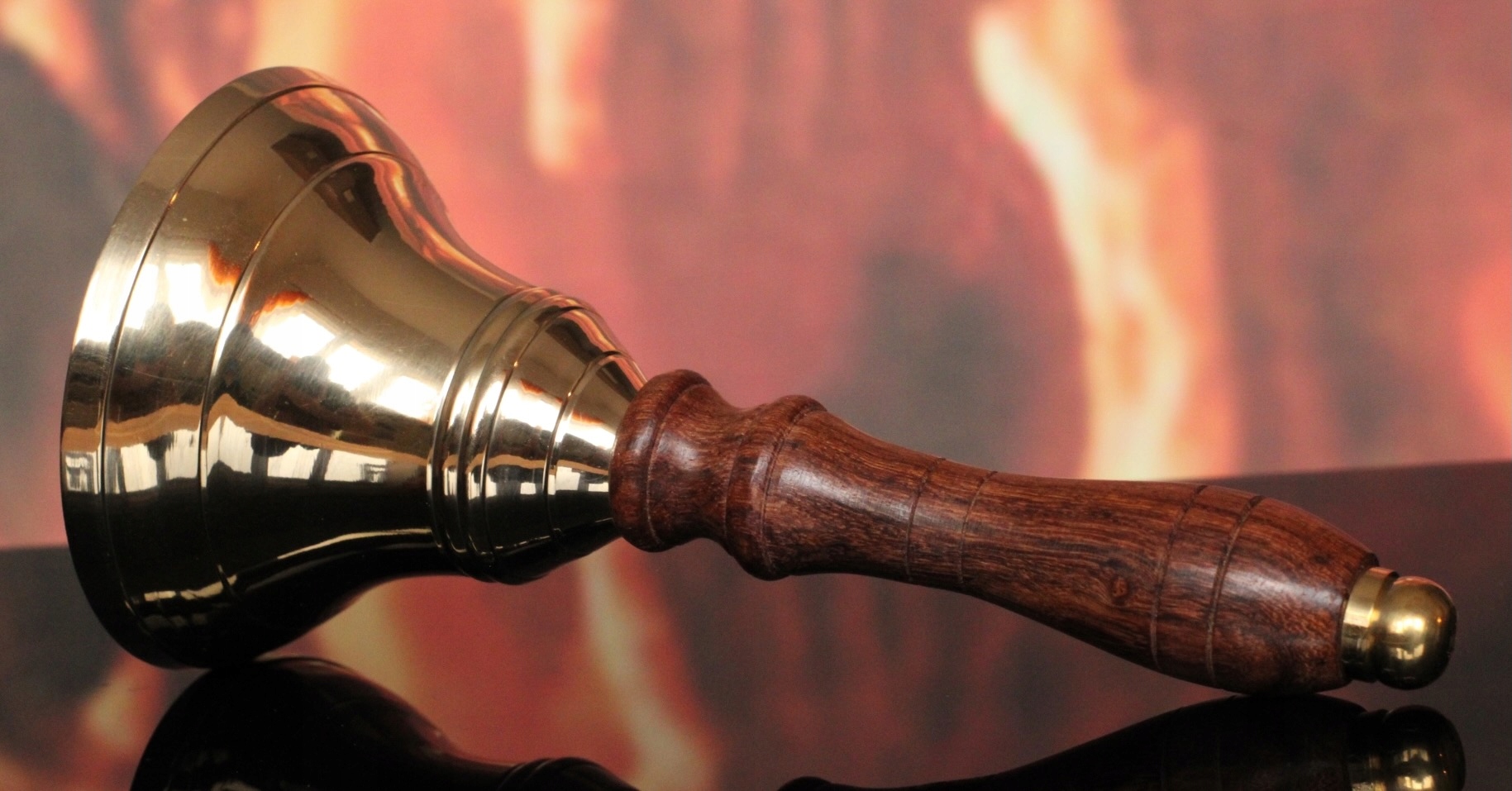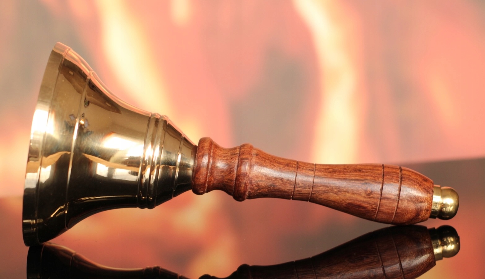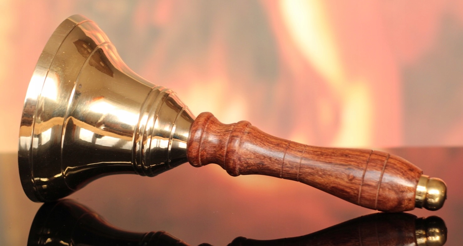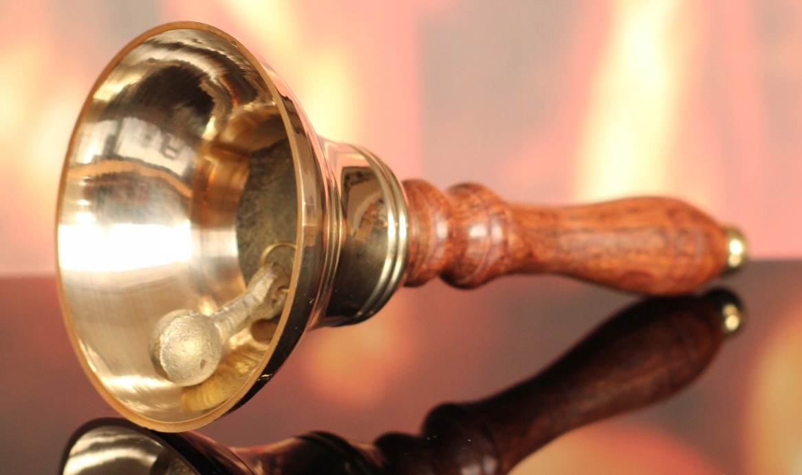 Dzwon dzwonek mosiężny z drewnianą rączką.