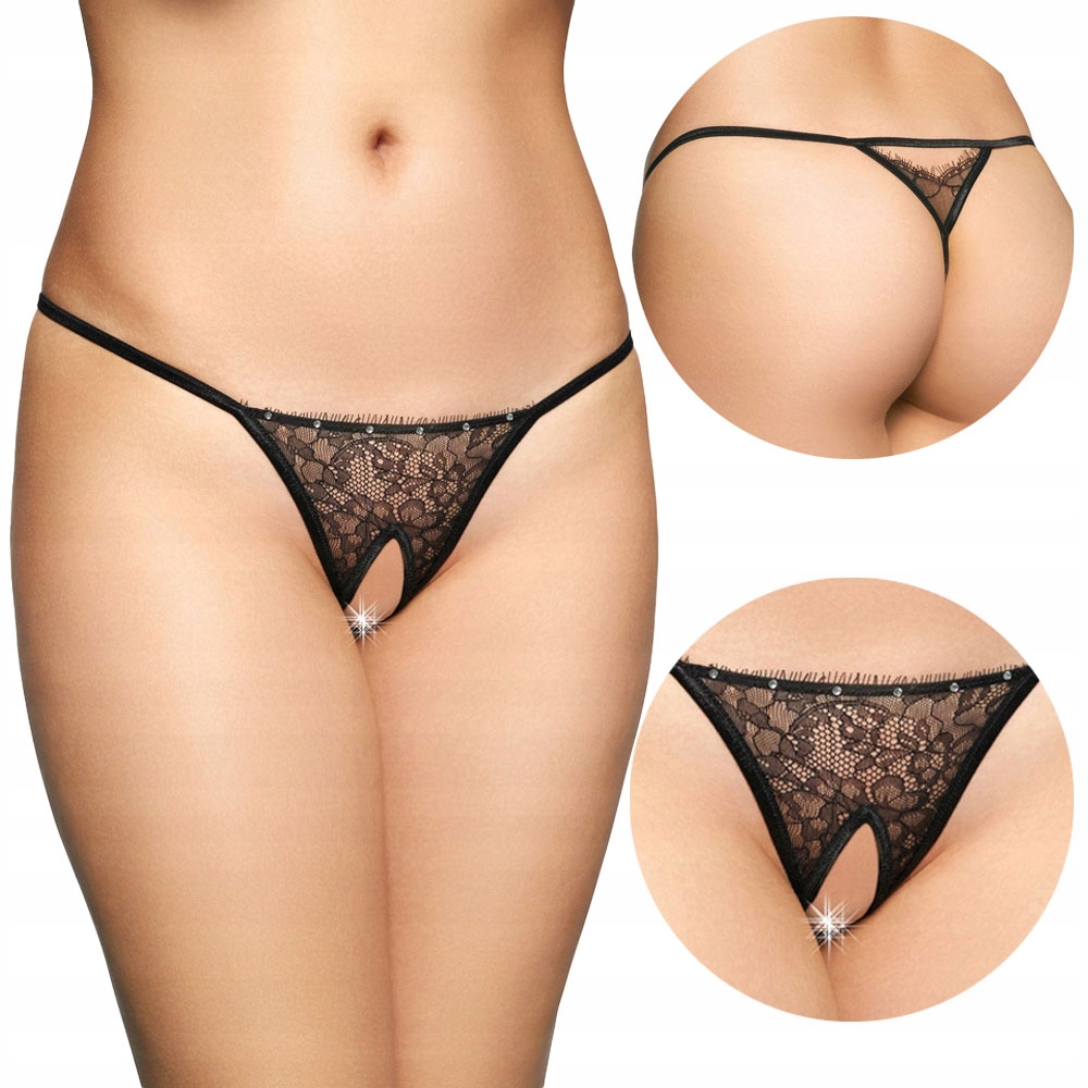 Стринги с дырочкой, украшенные стразами и кружевом.