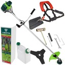 Ergonomiczne uchwyty oraz pasek na ramię pozwalają na użytkowanie tego narzędzia w komfortowy sposób przez dłuższy czas. W zestawie znalazły się również akcesoria: osłona szpuli z żyłą tnącą, nóż trójzębny, śruby oraz nakrętki, szelki nośne, klucz z wkrętakiem i sześciokątny, pojemnik na mieszankę benzynowo-olejową oraz osłona z tworzywa sztucznego.