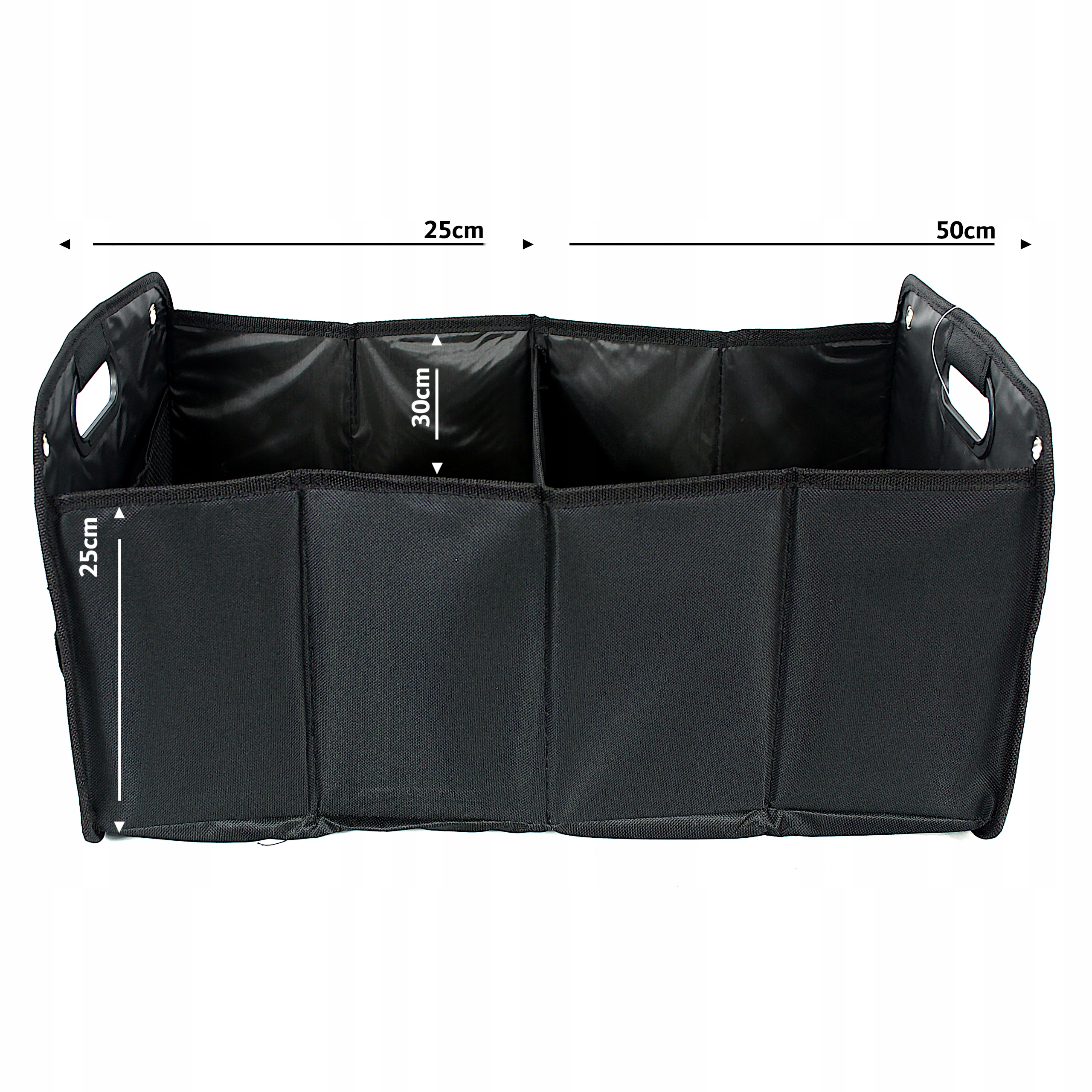 Складной, 2 отделения с ковриками на дно, 1 сетчатый карман, 2 ручки для переноски, с липучкой снизу для лучшего сцепления с землей багажника и 4 металлические проушины для дополнительного крепления. Благодаря эластичному ремню можно сложить, чтобы экономьте место, когда он не используется.