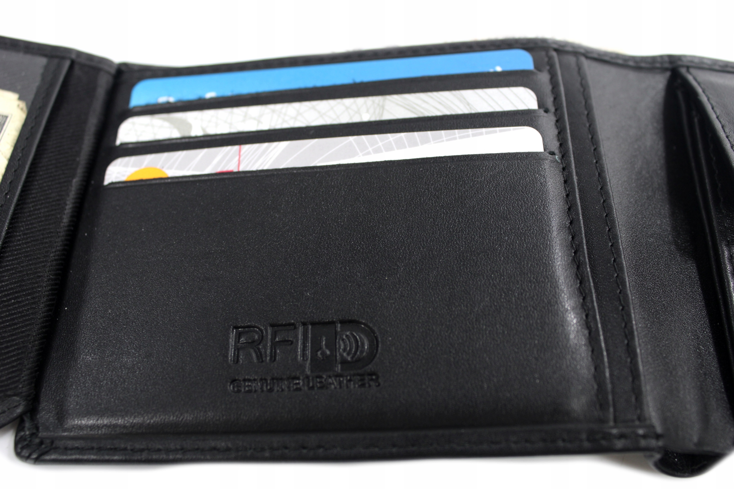 W portfelu znajduje się ochrona RFID. Jest to system, który zabezpiecza karty płatnicze przed kradzieżą środków jak i dokumenty biometryczne przed odczytaniem danych. Warto zadbać o bezpieczeństwo swoich dokumentów i zdecydować się na kupno portfela z zabezpieczeniem.
