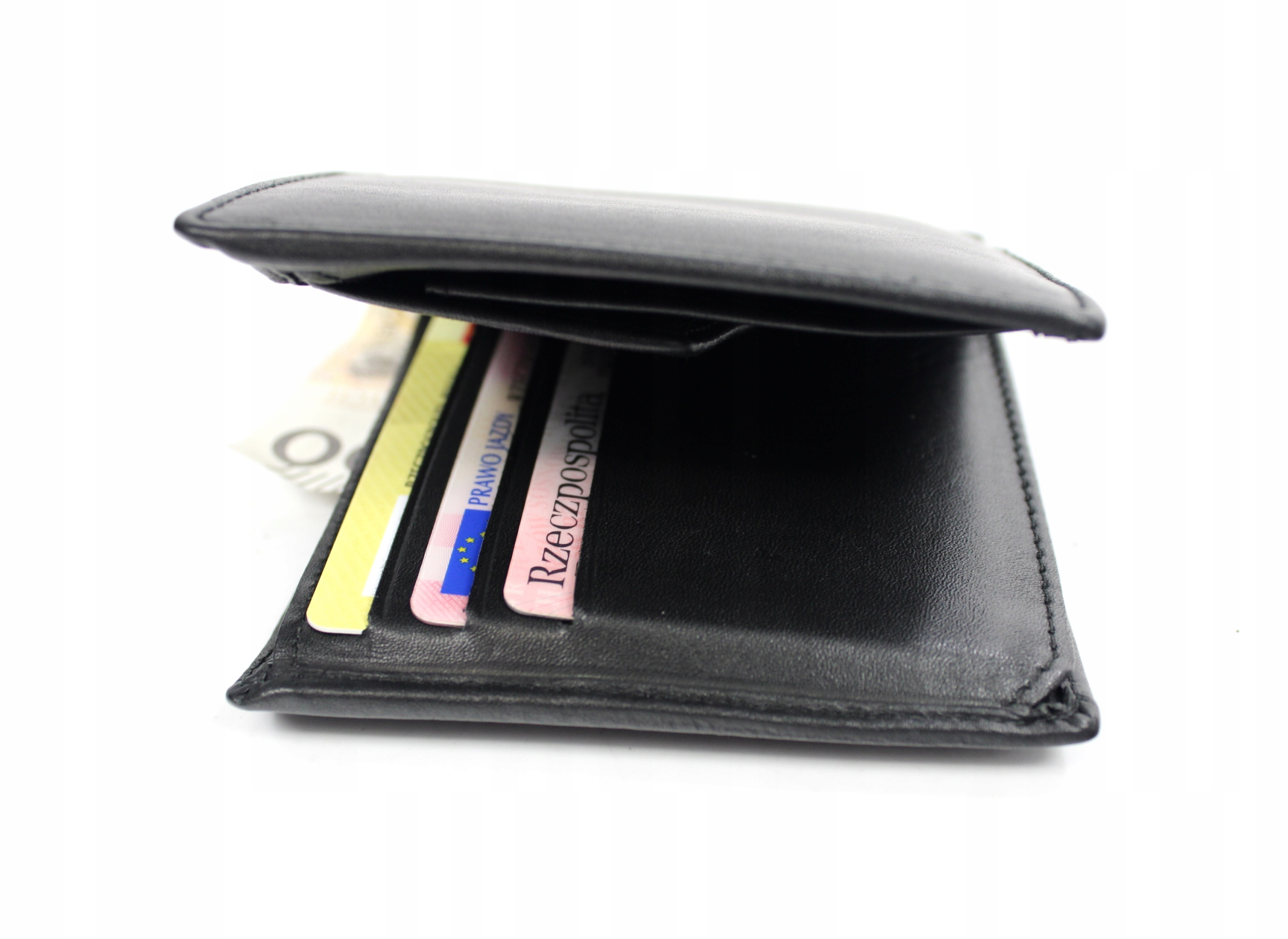 Portfel nie posiada zapięcia, co zapewnia szybki dostęp do jego wnętrza. Wewnątrz znajduje się kieszonka na monety zapinana na zatrzask, 6 miejsc na karty oraz jedno okienko ID. W portfelu znajdziemy także 2 przegrody na banknoty, które można wkładać w całości, bez konieczności składania oraz 3 dodatkowe, płaskie kieszonki.