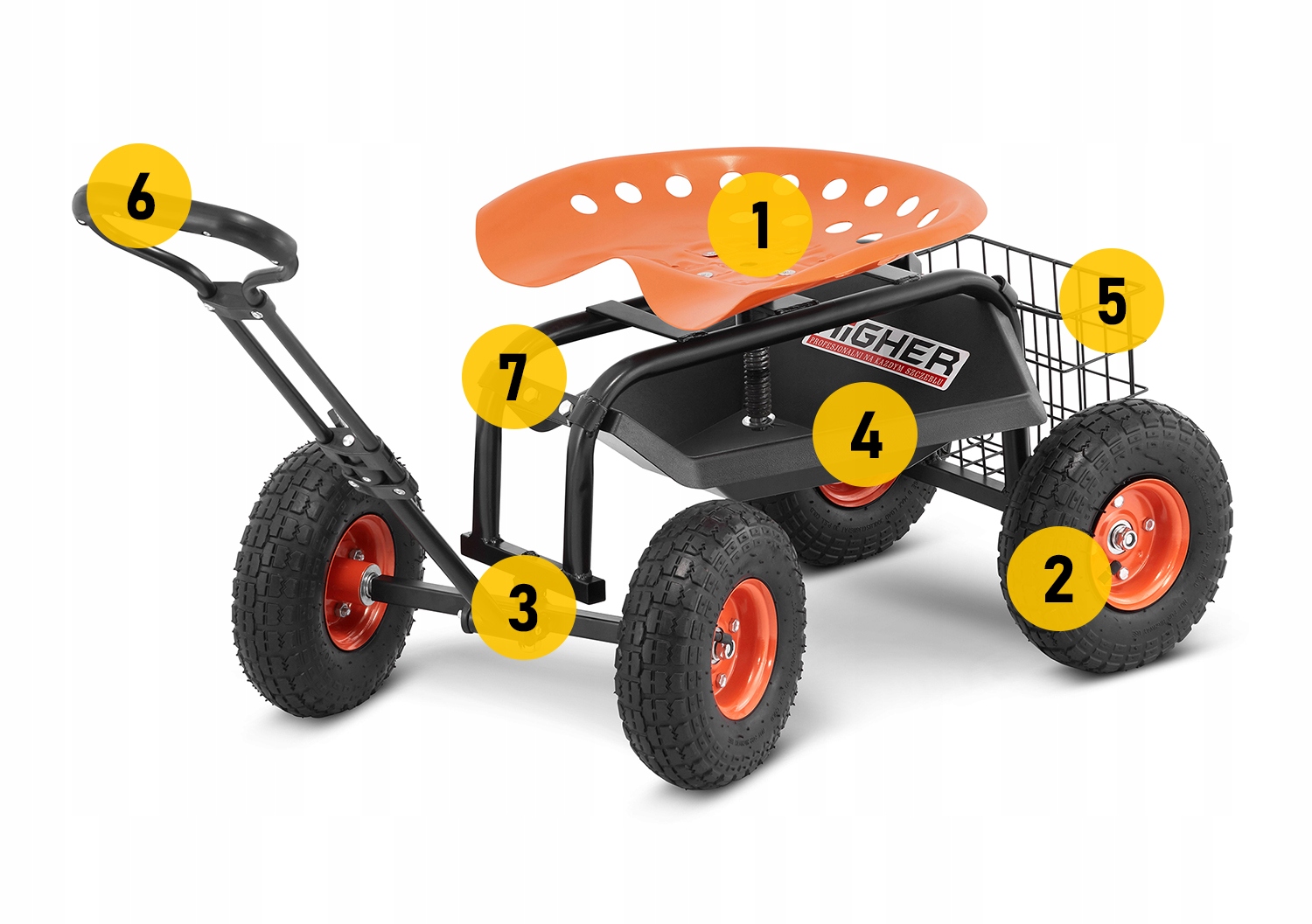 Универсальная и многофункциональная садовая тележка HIGHER с поворотным сиденьем на 360 градусов и регулируемая высота-идеальное решение для любых работ в саду, саду или приусадебном участке. Тележка была сконструирована с целью улучшения условий труда и, прежде всего, разгрузки позвоночник и колени при длительной работе. Конструкция тележки, которая была шире подробно описанная ниже, она обеспечивает комфортную и эргономичную длительную работу без усталости и перегрузки. Прочная стальная конструкция, рассчитанная на нагрузку до 150 кг, гарантирует безопасность и стабильность. Используемые нами прочные материалы, такие как сталь и пластик искусственный - гарантирует длительное и беспроблемное использование. Этот универсальный садовый стул может быть отличный инструмент в повседневной работе на участке, в саду, саду или даже мастерской или гараж.