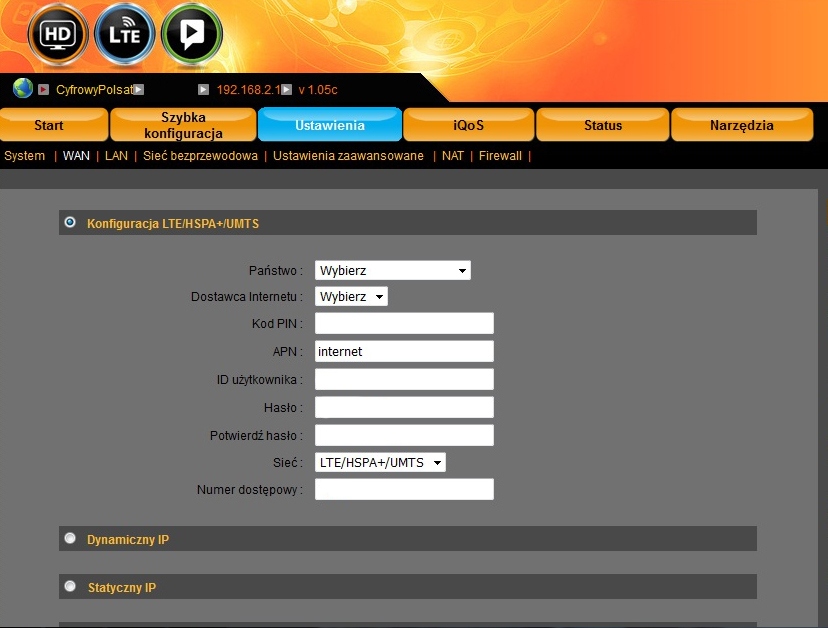 После установки соответствующего часового пояса нажимаем кнопку "Далее" и выбираем "Настройка LTE / HSPA / UMTS" где мы устанавливаем страну на Польшу, мы выбираем своего оператора сети и вводим соответствующий APN. Список APN доступных в Польше сетей GSM можно найти в PDF прилагается к аукциону - вы можете найти его в нижней части аукциона в специальном разделе " Дополнительно информация".