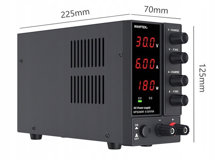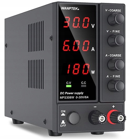 Stabilizowany zasilacz laboratoryjny Wanptek z płynną regulacją napięcia w zakresie od 0 do 30 V oraz prądu w zakresie od 0 do 6 A. Ma wbudowany wyświetlacz oraz wentylator zapewniający prawidłowe chłodzenie. Zasilacz może pracować w dwóch trybach: C.V. (stałego napięcia wyjściowego) oraz C.C. (stałego prądu obciążenia). Wyposażony został w zabezpieczenie przed zwarciem, przegrzaniem i przeciążeniem. Dzięki niedużym wymiarom znakomicie sprawdzi się w każdym warsztacie elektronika.