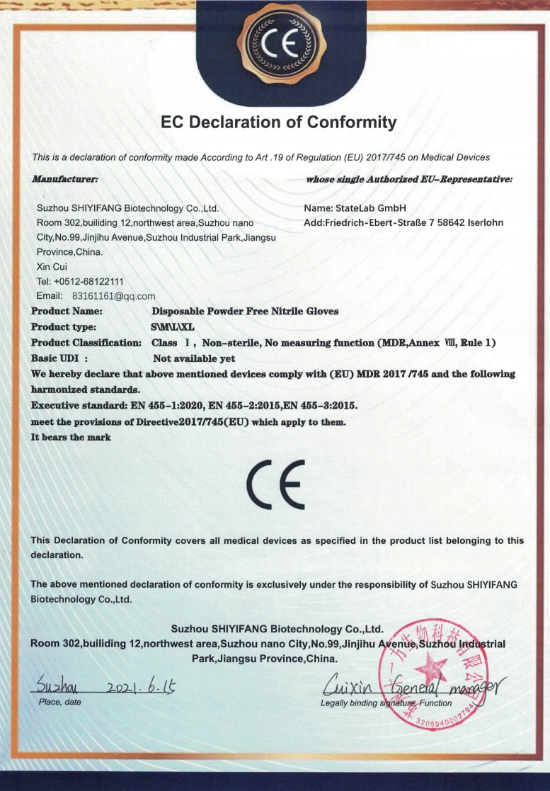 Декларация соответствия: NB 2777, перчатки в соответствии со стандартами EN ISO 374-5:2016 EN 16523, EN 455 1-4 .