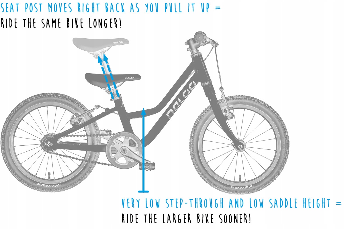 Dzięki bardzo nisko osadzonej ramie i niskiemu siodełku dzieci mogą jeździć na rowerze NALOO już w bardzo młodym wieku. A dzięki sztycy, która przesuwa się daleko do tyłu po jej wyciągnięciu, odległość między kierownicą a siodełkiem zwiększa się wraz ze wzrostem długości nogi. Dzięki „Adaptive Frame Design” dzieci mogą wcześniej wybrać większą ramę i jeździć na niej dłużej. Oznacza to dłuższą przyjemność z jazdy na tym samym rowerze i brak początkowych trudności podczas przesiadki na kolejny większy rower.