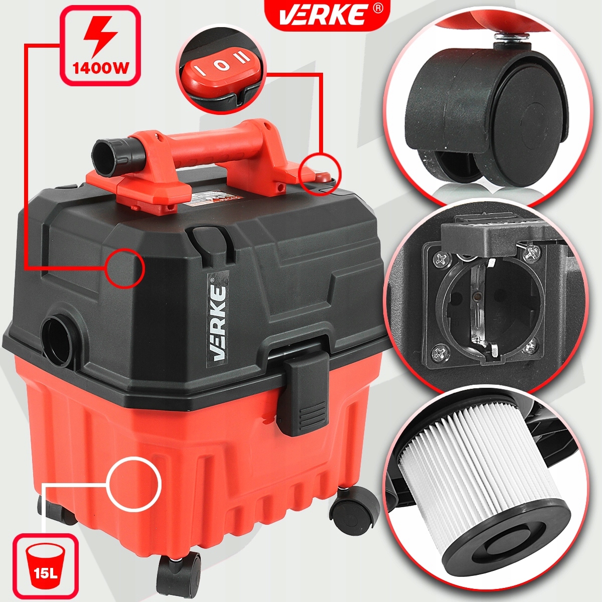 Промышленный пылесос VERKE идеально подходит для влажной уборки и сухие поверхности. В этом устройстве используется высокопроизводительный электродвигатель мощностью 1400 Вт и прочный бак.