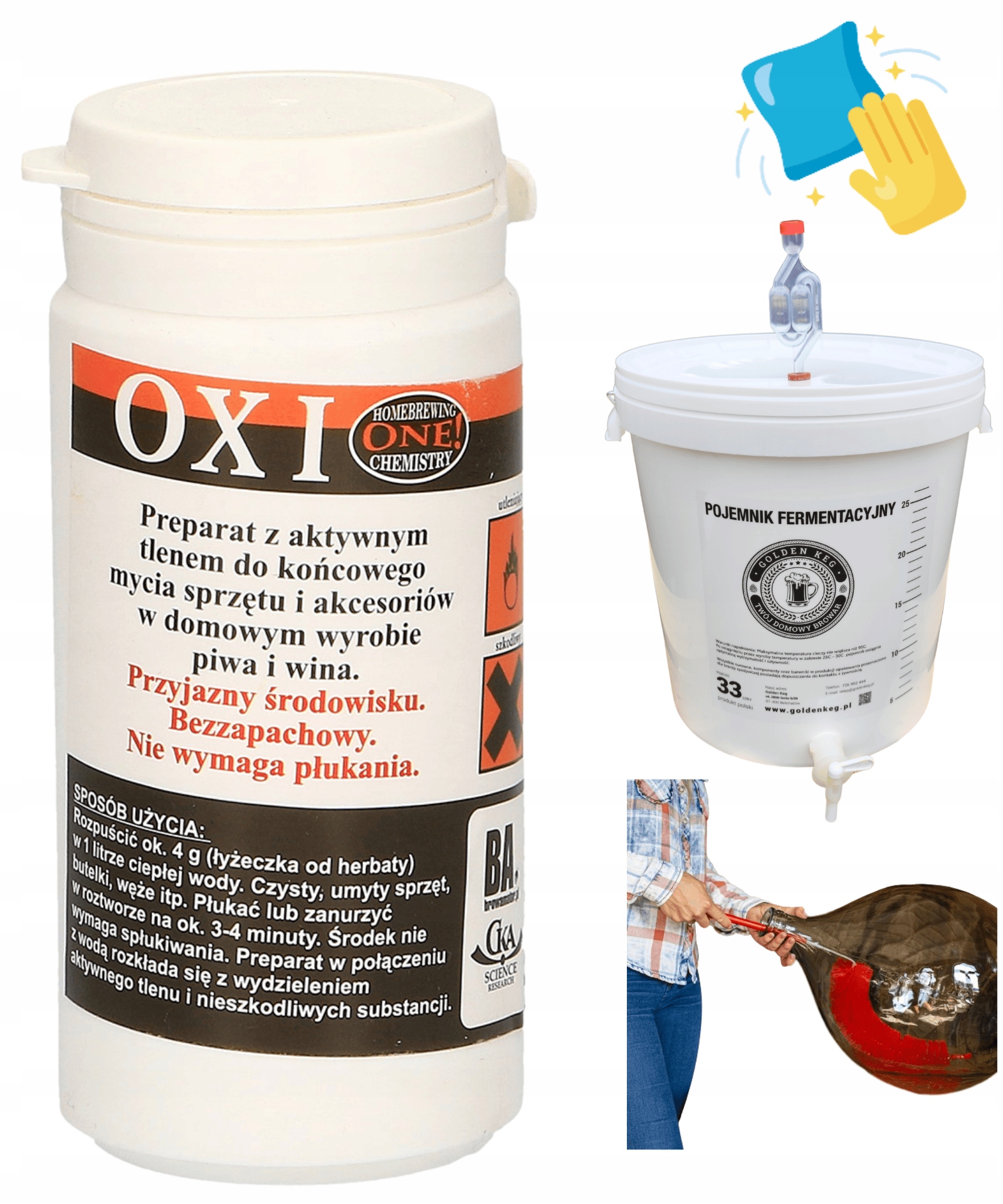 Preparat z aktywnym tlenem przeznaczony do mycia sprzętu winiarskiego i piwowarskiego - bardzo skuteczny, przyjazny dla środowiska, bezzapachowy.
