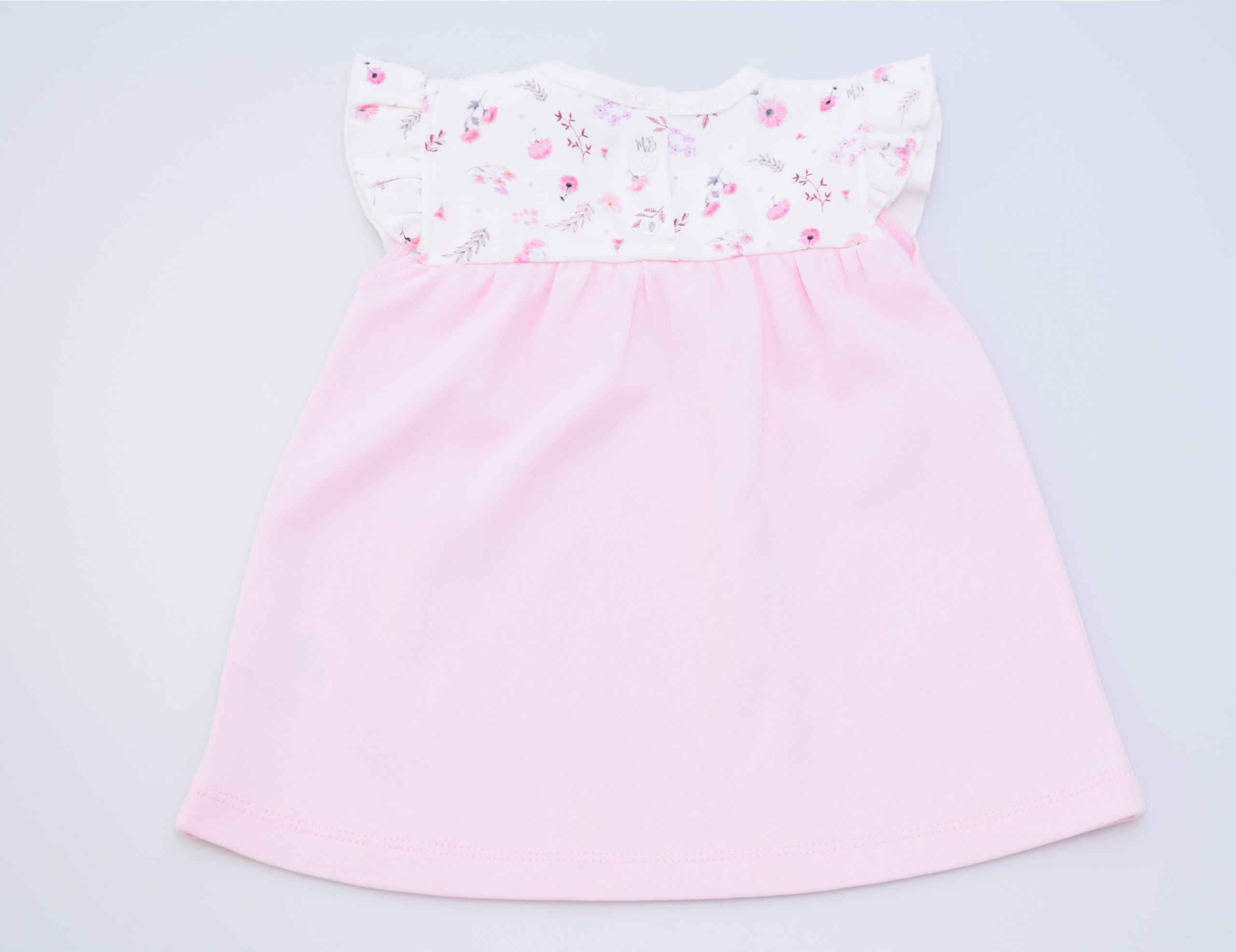 ✳️ Różowa rozkloszowana sukienka. Sukienka zapinana na zatrzaski na plecach. Górna część sukienki w kwiaty. Ozdobna falbanka w kwiaty i różowa kokardka. Bez rękawków. Ściągacz wokół szyi. W zestawie z sukienką jest biała opaska z różową kokardą. Opaska w formie elastycznej gumy.