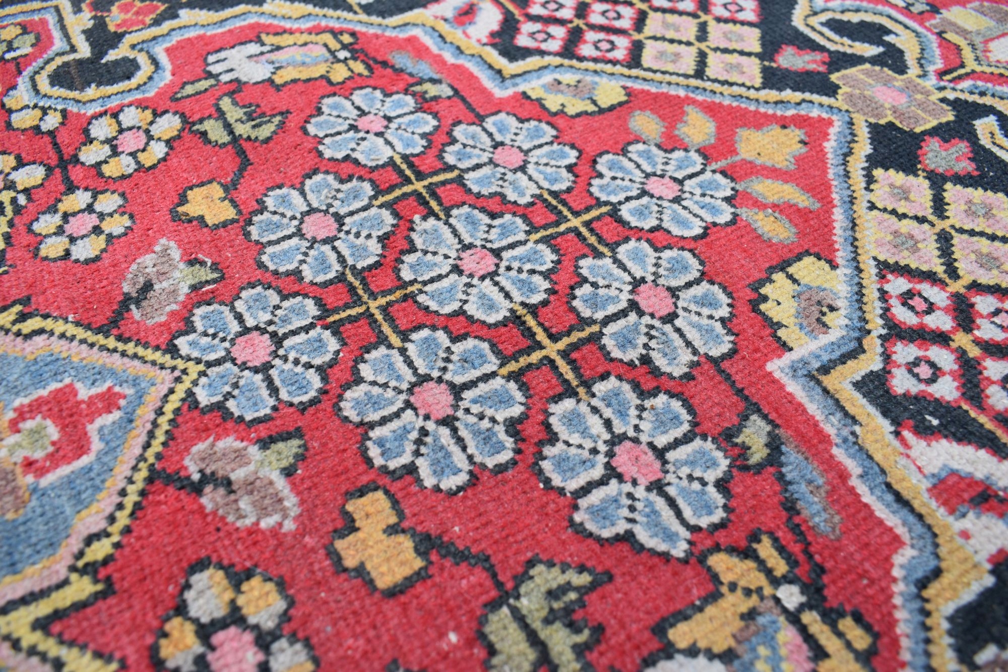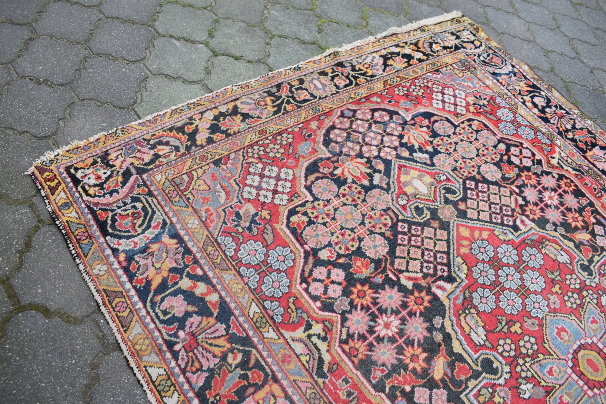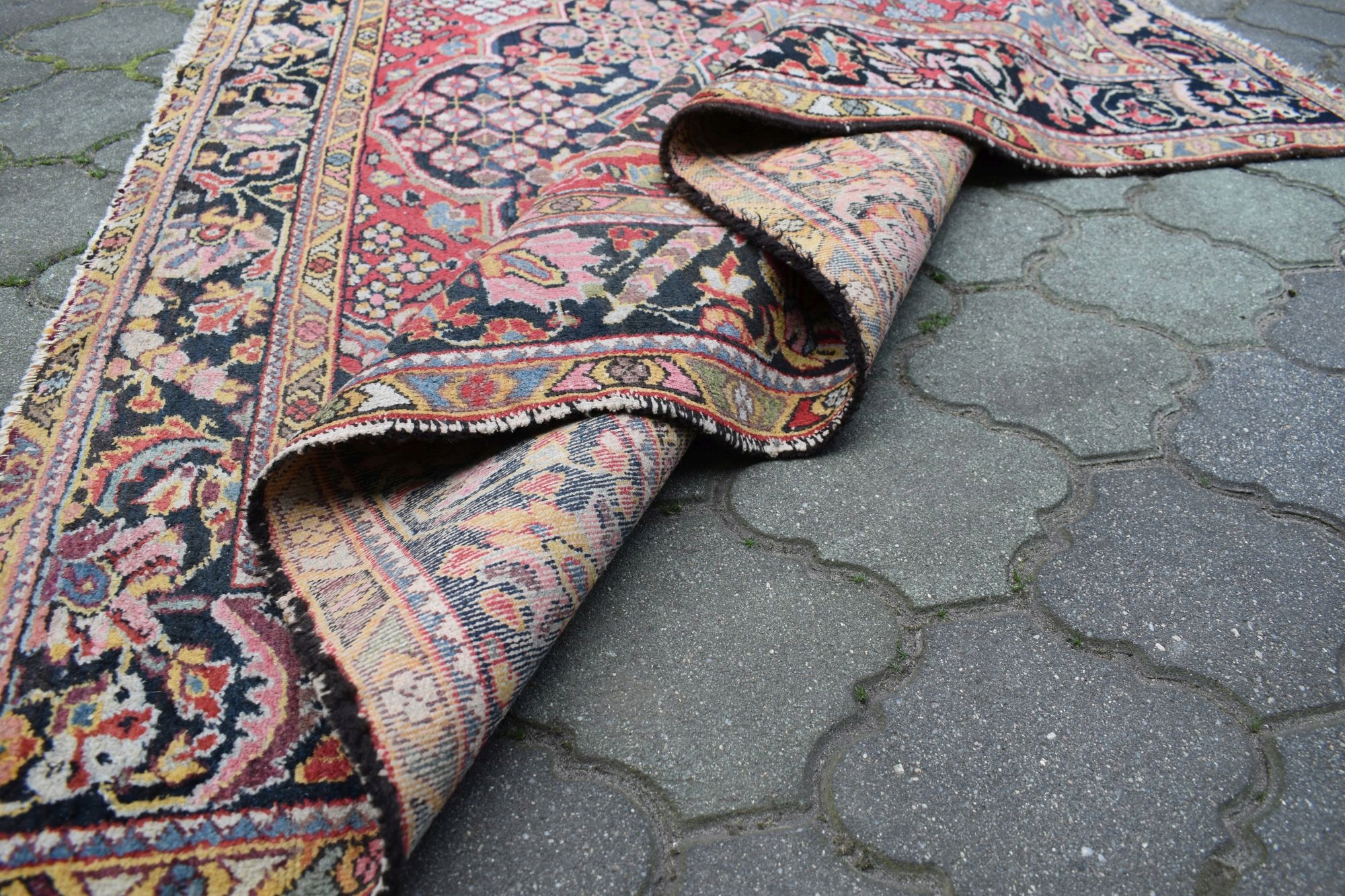 Stan: Dywan używany jak na swoje lata zachowany w stanie dobrym - vintage - odsyłam do galerii. Dla własnego komfortu zalecam odświeżenie.