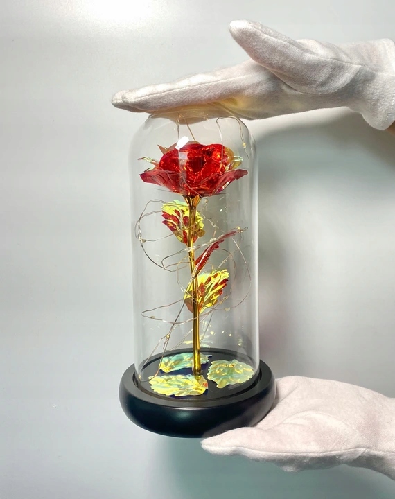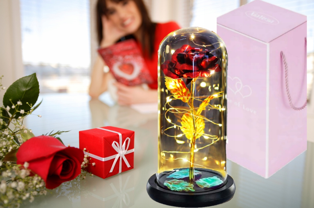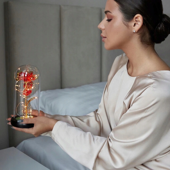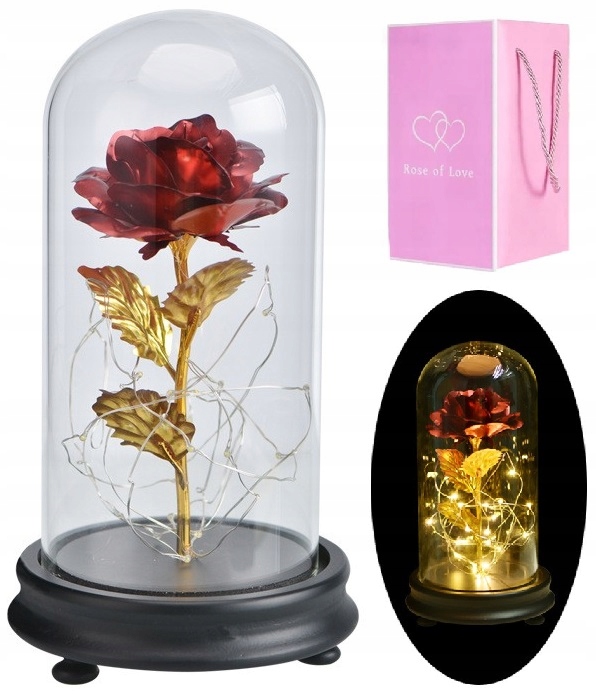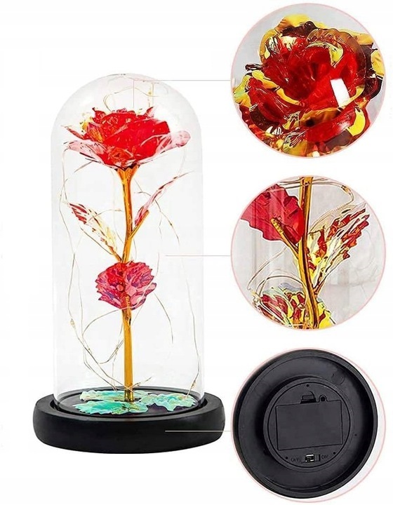 ➡️ Róża znajduje się w kloszu wykonanym z wysokiej jakości szkła (szkło jest przezroczyste i trwałe). Wokół róży znajduje się taśma LED, która sprawia, że róża jest bardzo urocza w nocy (pięknie podświetlona). Wystarczy włączyć przełącznik, diody LED zaświecą się w jasnej, ciepłej barwie, tworząc wyjątkową i romantyczną atmosferę na romantyczną kolacje, rodzinną kolację, spotkanie, spokojny, relaksujący wieczór, itp.