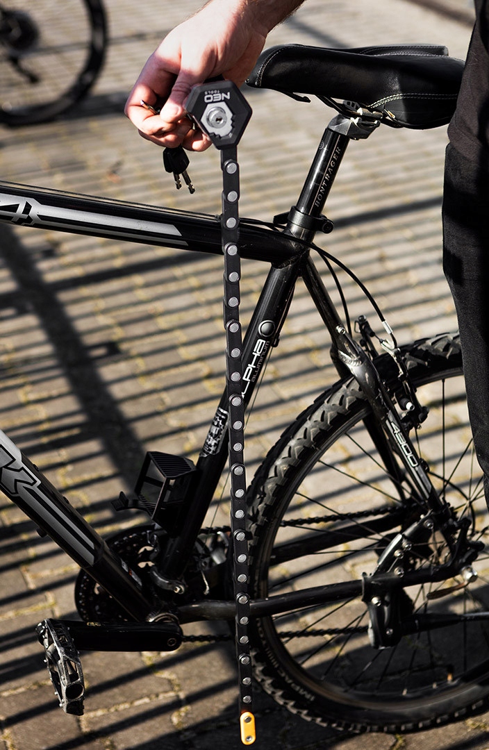 Zapięcie rowerowe, składane na klucz 91-006 marki NEO o długości całkowitej 78 cm i wadze 615 g.