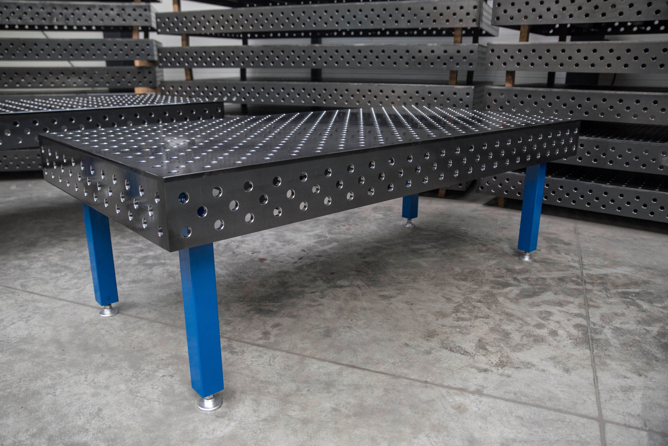 Stoły z systemem otworów 28 w siatce 100mm i dodatkowo grawerowaną podziałką również w siatce 100mm, to najbardziej popularne połączenie systemu mocowania narzędzi i punktów odniesienia do montażu konstrukcji.