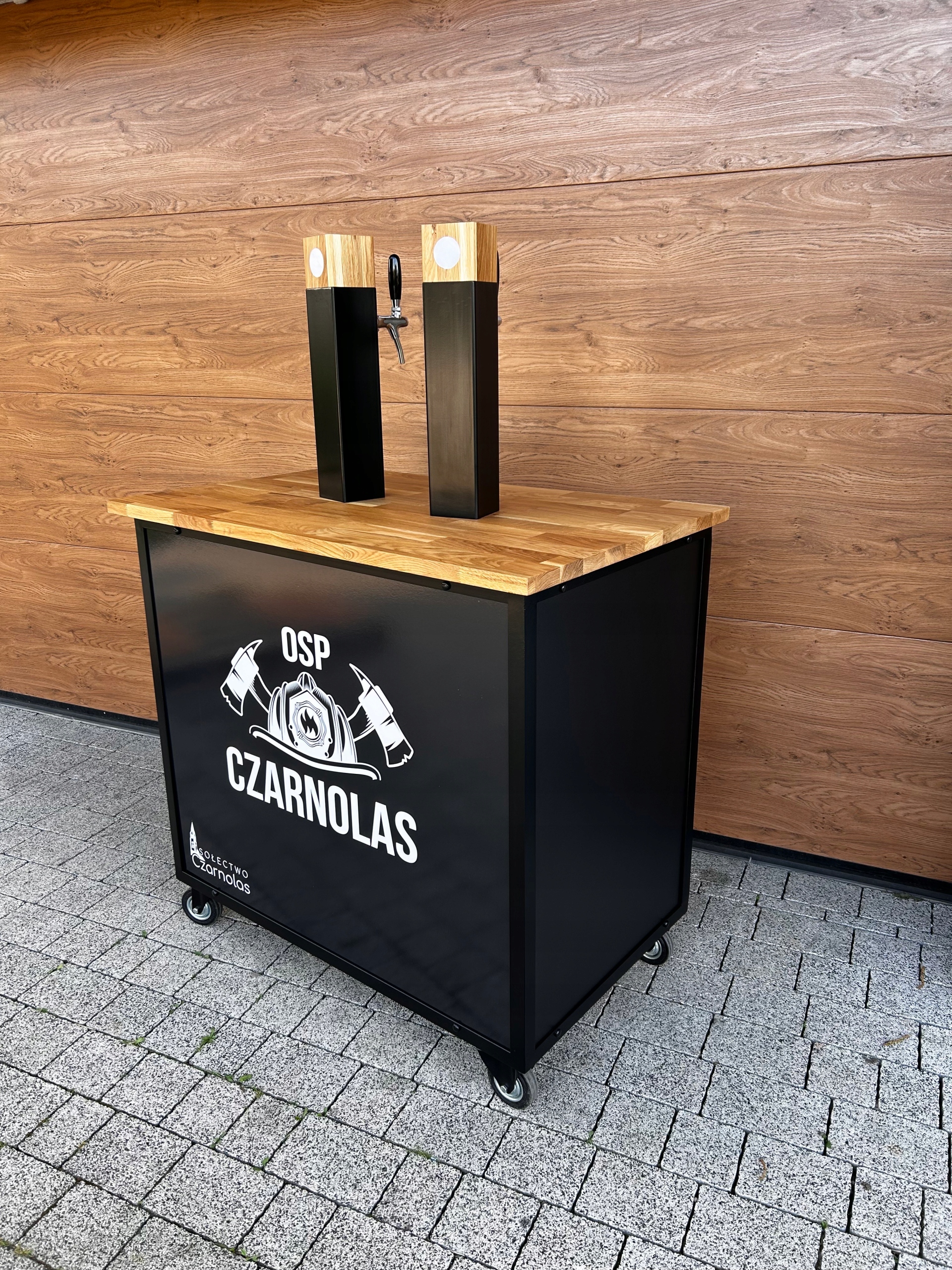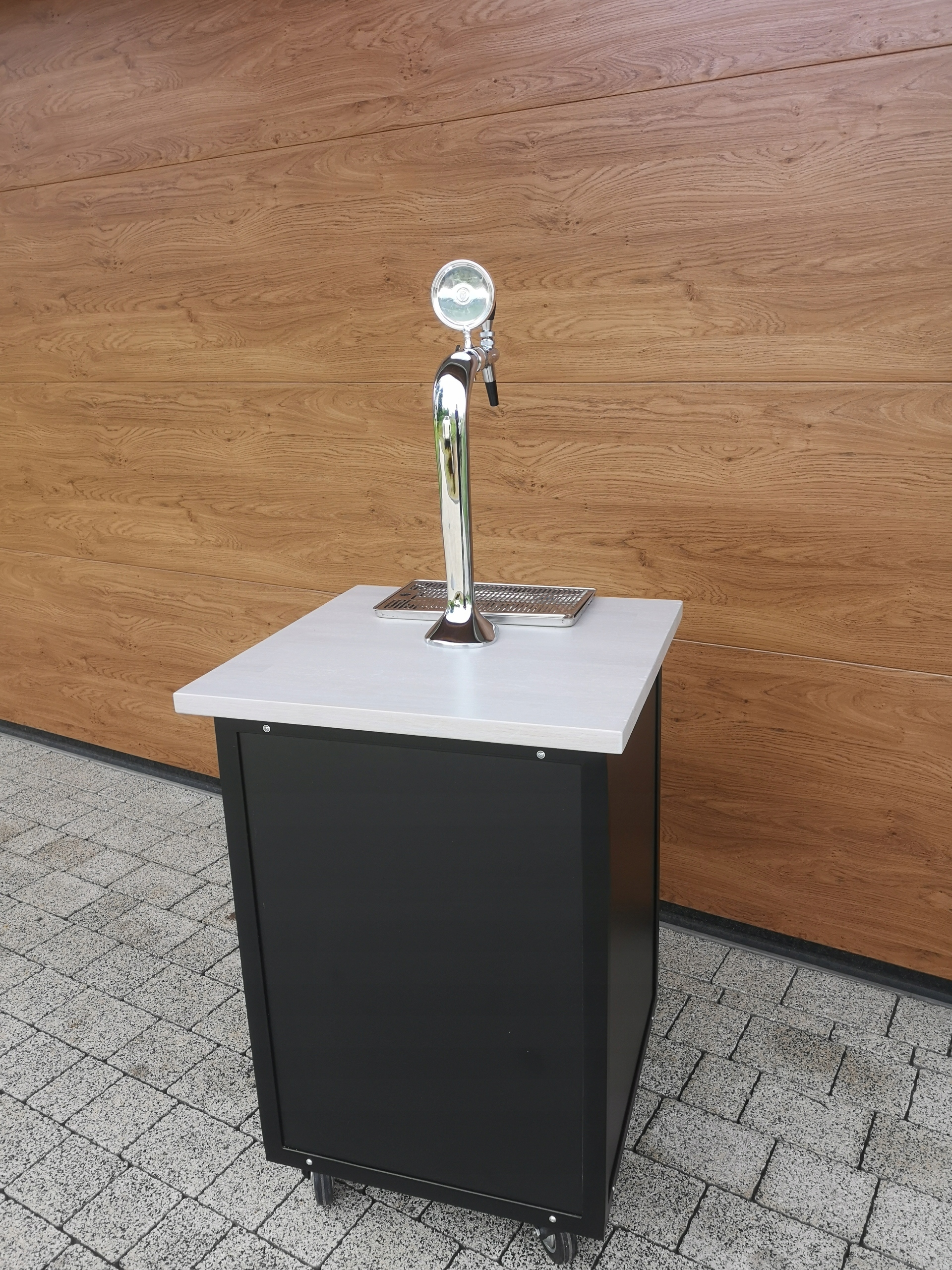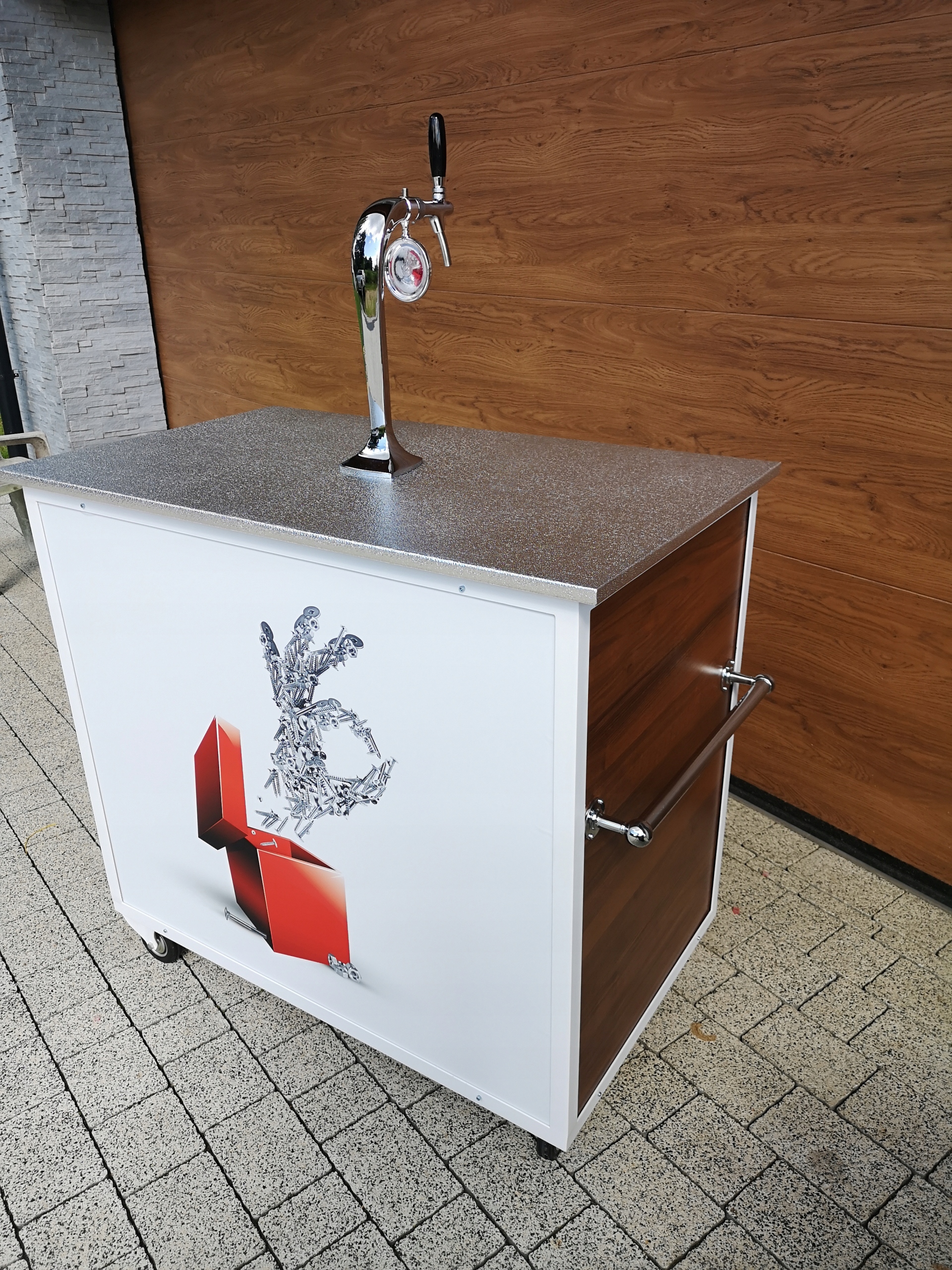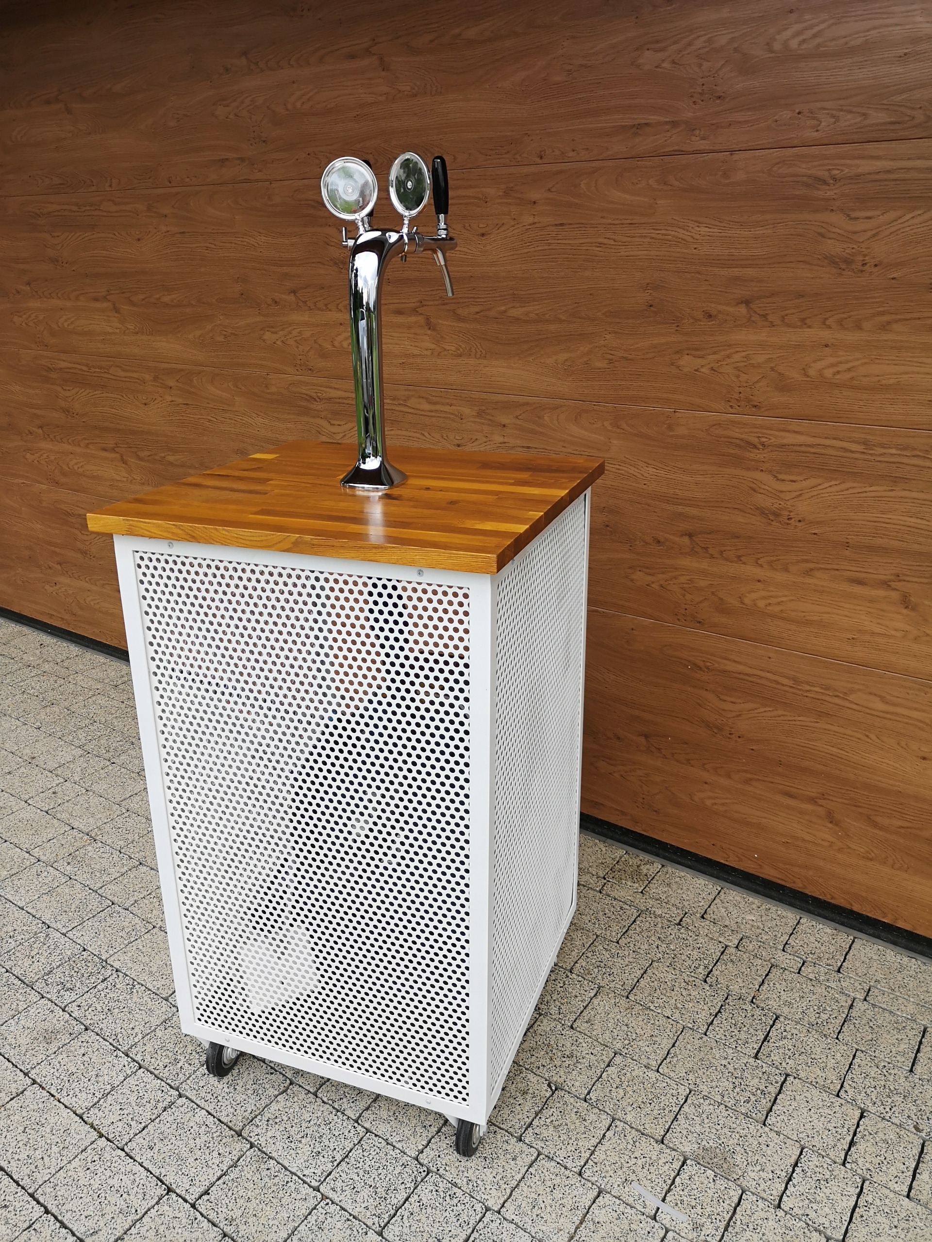 Instalacja piwna zamontowana na ruchomym wózku ze stelaża metalowego. (Jest to bardzo ważny element)Rollbary bez stelaża nie posiadają odpowiedniej sztywności i po niedługim czasie użytkowania się "rozjeżdżają" Posiada 4 kółka, dwa skrętne i dwa stałe w tym jedno z hamulcem.