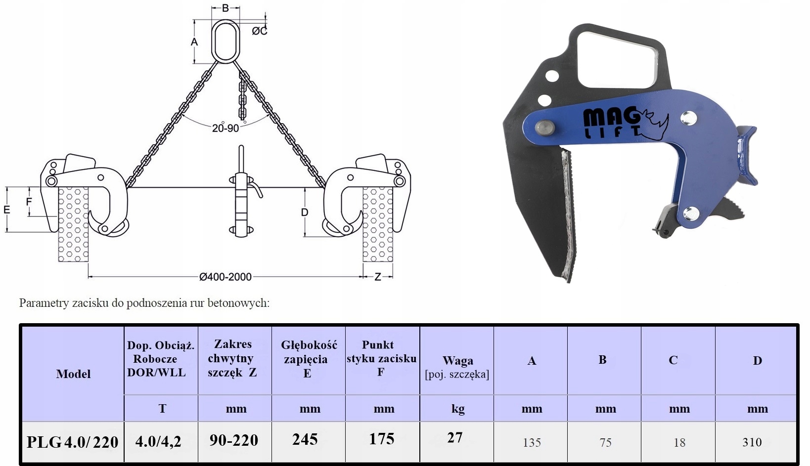 ZASTOSOWANIE: - do transportu pionowego i poziomego kręgów betonowych o różnych grubościach ścianek. Można je stosować do kręgów twardych i suchych. Uchwyty są osprzętem dodatkowym na haku żurawia, suwnicy, dźwigu, hds, koparki, ładowarki lub innego urządzenia do transportu pionowo - poziomego..