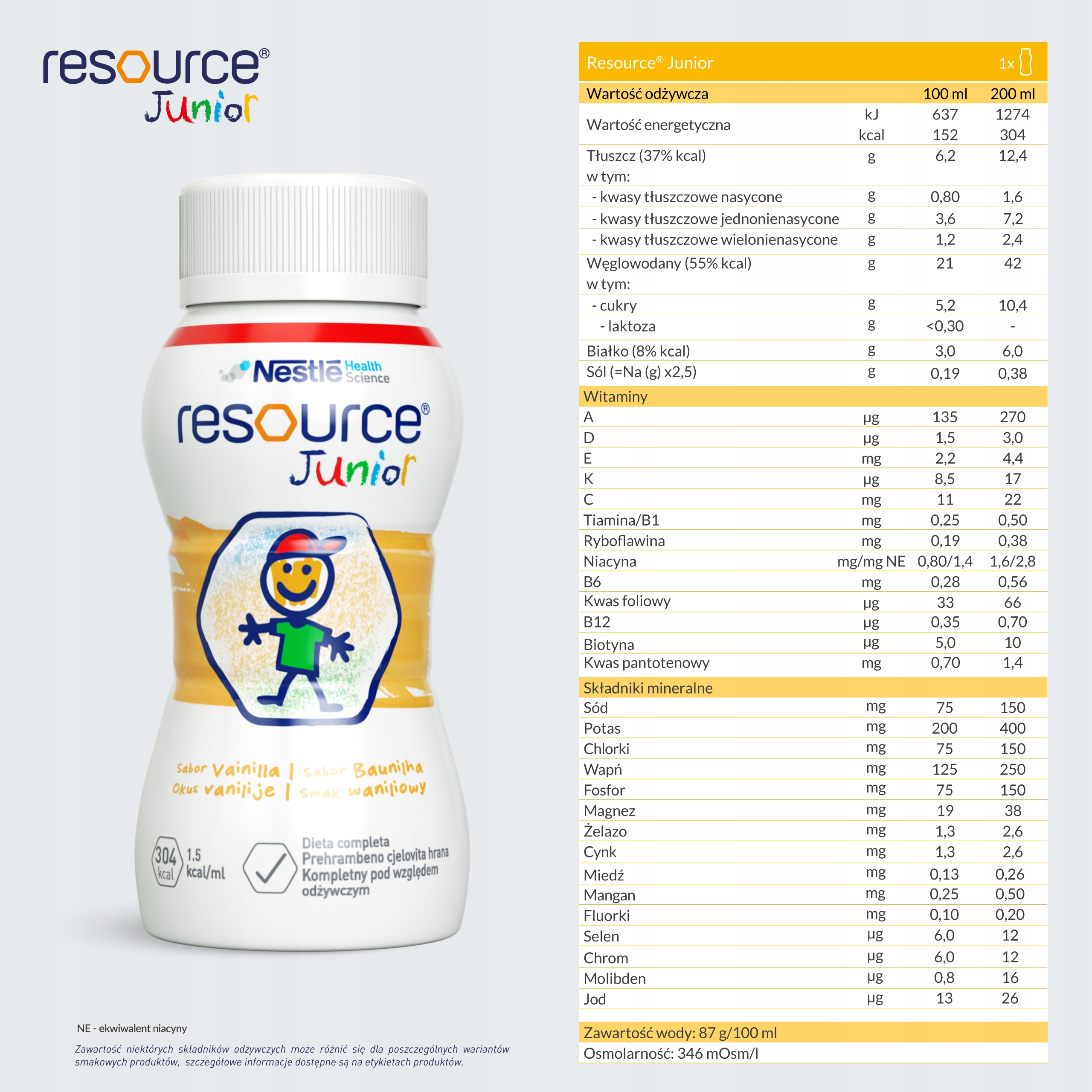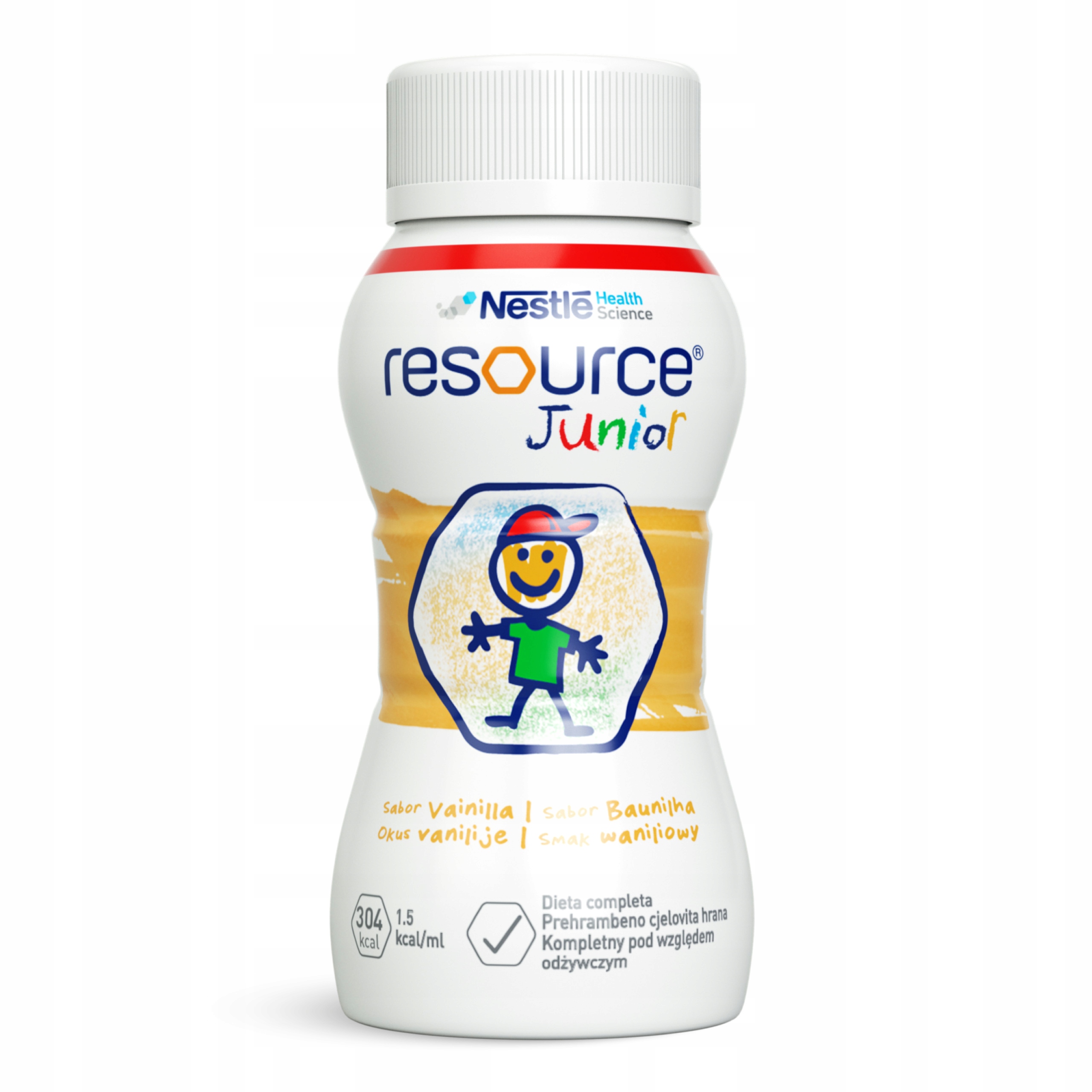 To kompletna pod względem odżywczym, wysokoenergetyczna dieta w płynie przeznaczona dla dzieci powyżej 1. roku życia. Skonsultuj z lekarzem wprowadzenie do diety produktu Resource Junior.