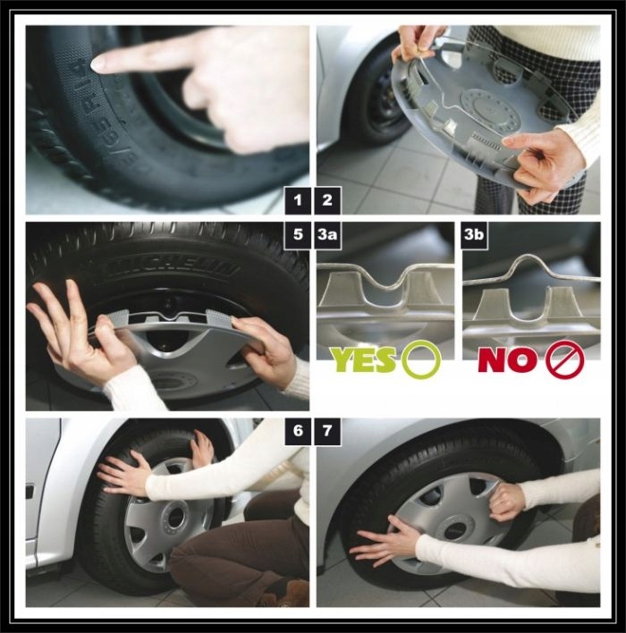(Montaż jest niezwykle prosty - polega na wciśnięciu kołpaka na felgę poprzez metalowy pierścień dociskowy. W każdym kołpaku został przygotowany otwór na wentyl.)