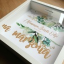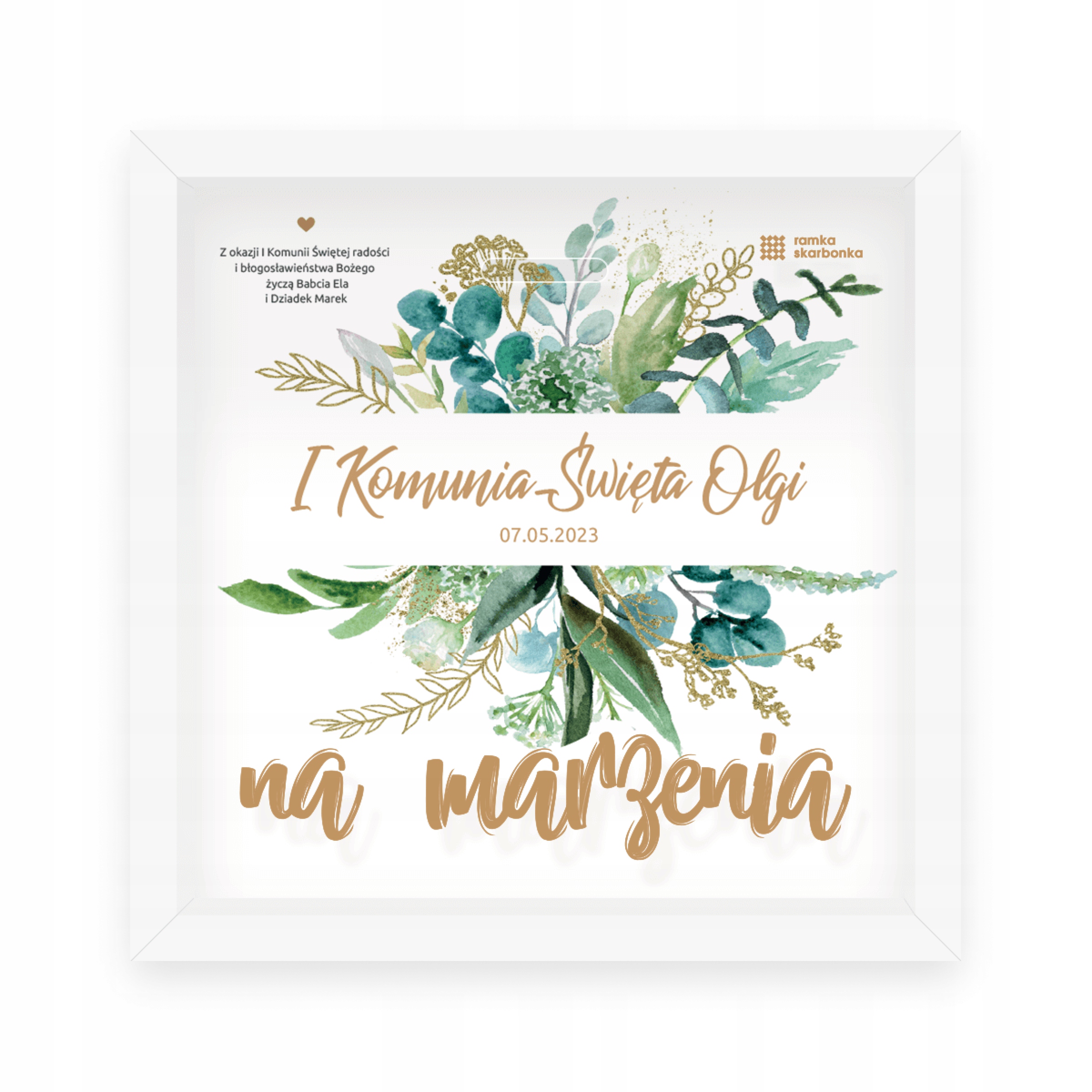 Ramka Skarbonka na I Komunię Świętą z zielonym motywem kwiatowym to nie tylko piękna dekoracja, ale także praktyczne miejsce do gromadzenia oszczędności dla małego bohatera. Unikalny projekt ramki łączy w sobie elegancję i funkcjonalność, oferując dzieciom wspaniałą pamiątkę tego ważnego dnia w ich życiu, a także praktyczne miejsce na oszczędzanie na marzenia.