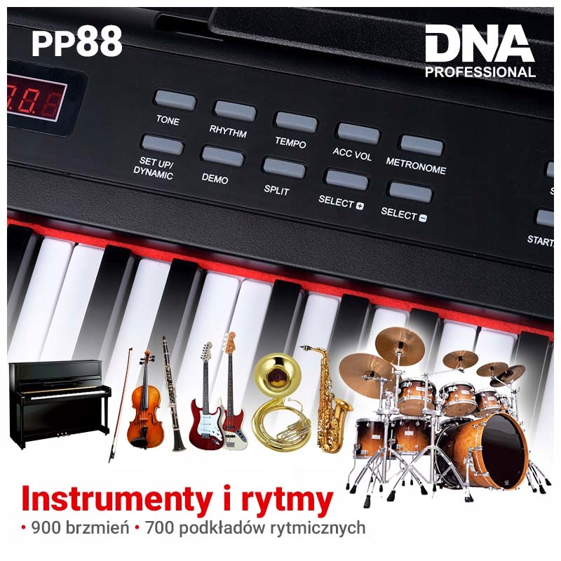 DNA PP 88 to ✅ przenośne pianino cyfrowe typu stage pianio wyposażone w 88 pełnowymiarowych klawiszy z funkcją kontroli dynamiki. Doskonale nadaje się do codziennej gry, ćwiczeń oraz nauki, a dzięki funkcjom keyboardu oraz bogatym bankom brzmień i podkładów rytmicznych stanowi również świetny instrument do zabawy. Pozwala samodzielnie tworzyć, poznawać bogaty świat dźwięków, akordów i stylów muzycznych, rozwija poczucie rytmu, a także słuch i wrażliwość muzyczną. To ✅ bardzo dobre pianino na start oraz przyszłość, które tak naprawdę jest czymś więcej, niż tylko pianinem.