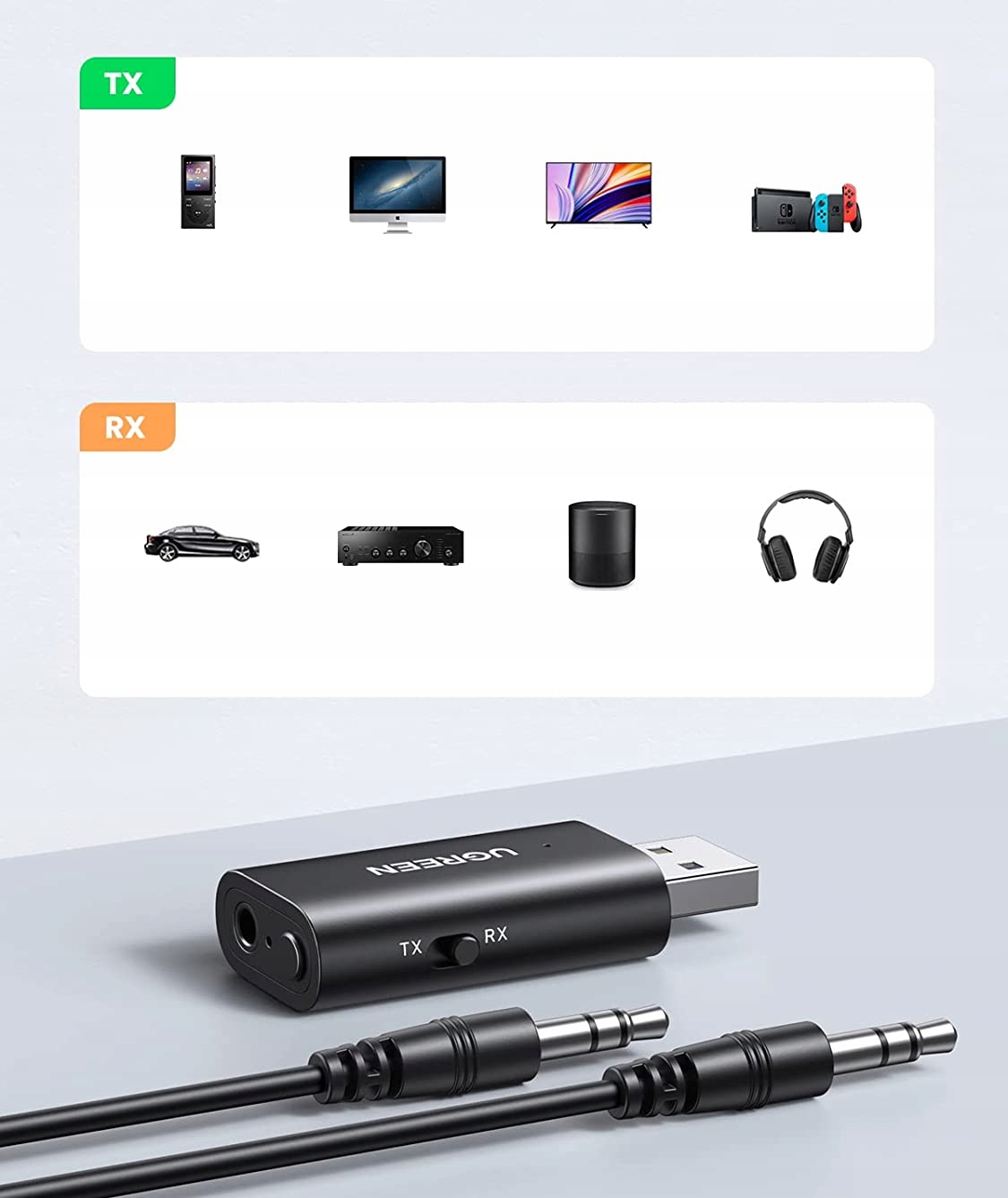Dzięki transmiterowi Ugreen możesz cieszyć się zarówno bezprzewodowym, jak i przewodowym odtwarzaniem dźwięku na różnych urządzeniach, zapewniając sobie większą elastyczność i wygodę.