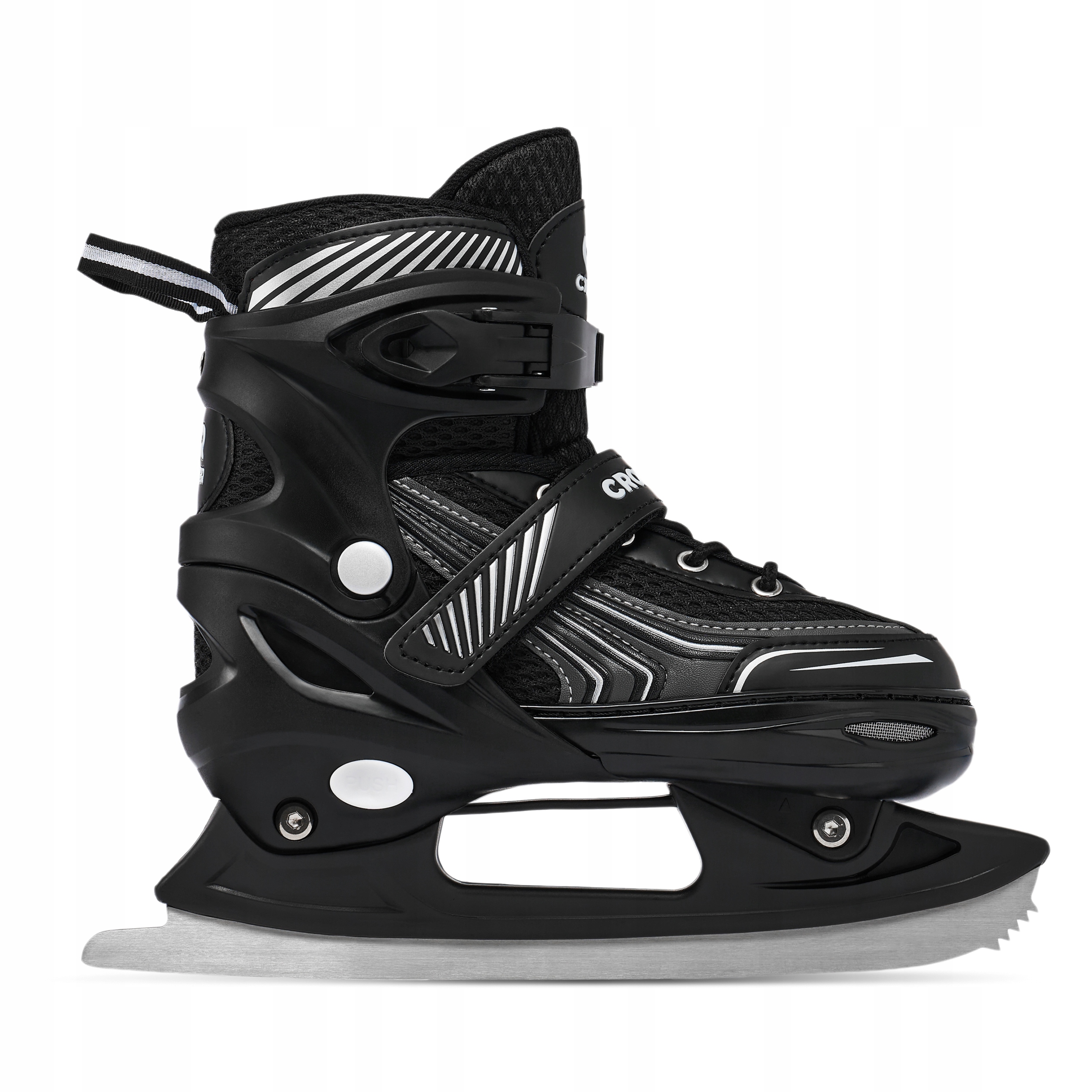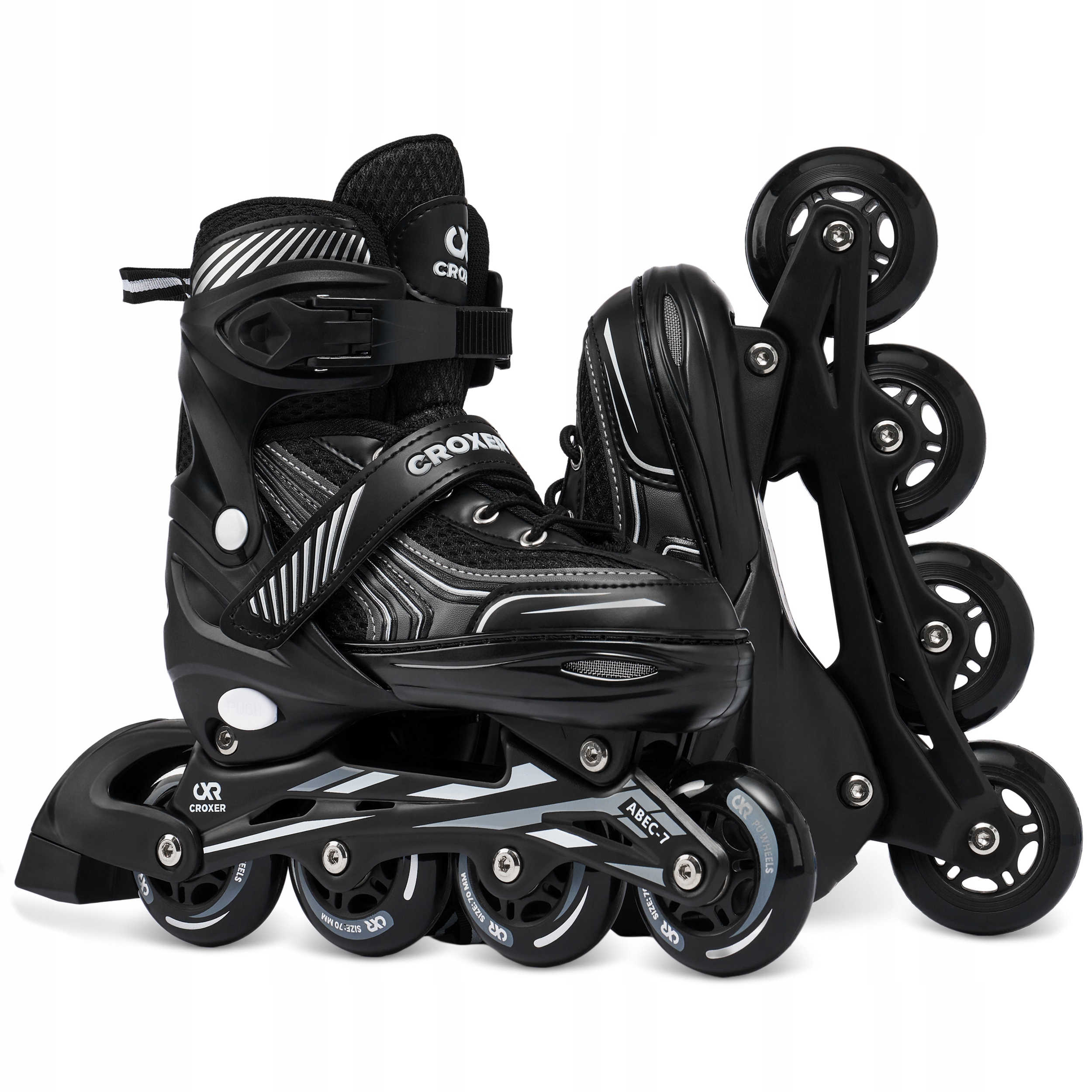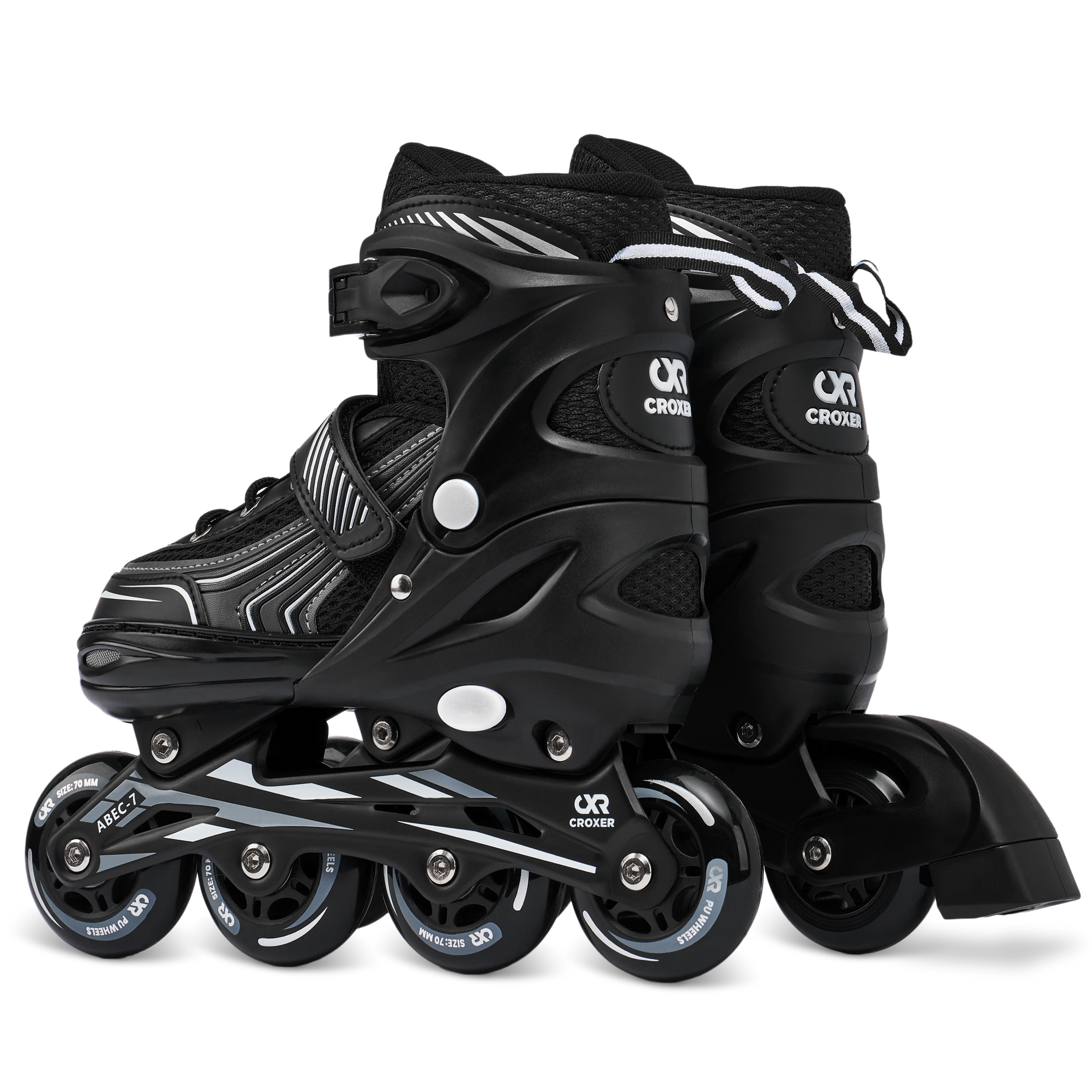 Sznurowadła, klamra z paskiem zębatym oraz zatrzask zapewniają odpowiednie ściągnięcie i pewne trzymanie stopy w bucie, zapobiegają przemieszczaniu się stopy i gwarantują bezpieczną jazdę. Zatrzaski w rolkach Croxer posiadają przycisk, który zapobiega ich rozpinaniu podczas jazdy. Pasek na rzep pozwala przytrzymać sznurowadła, powstrzymując je przed przypadkowym rozwiązaniem.