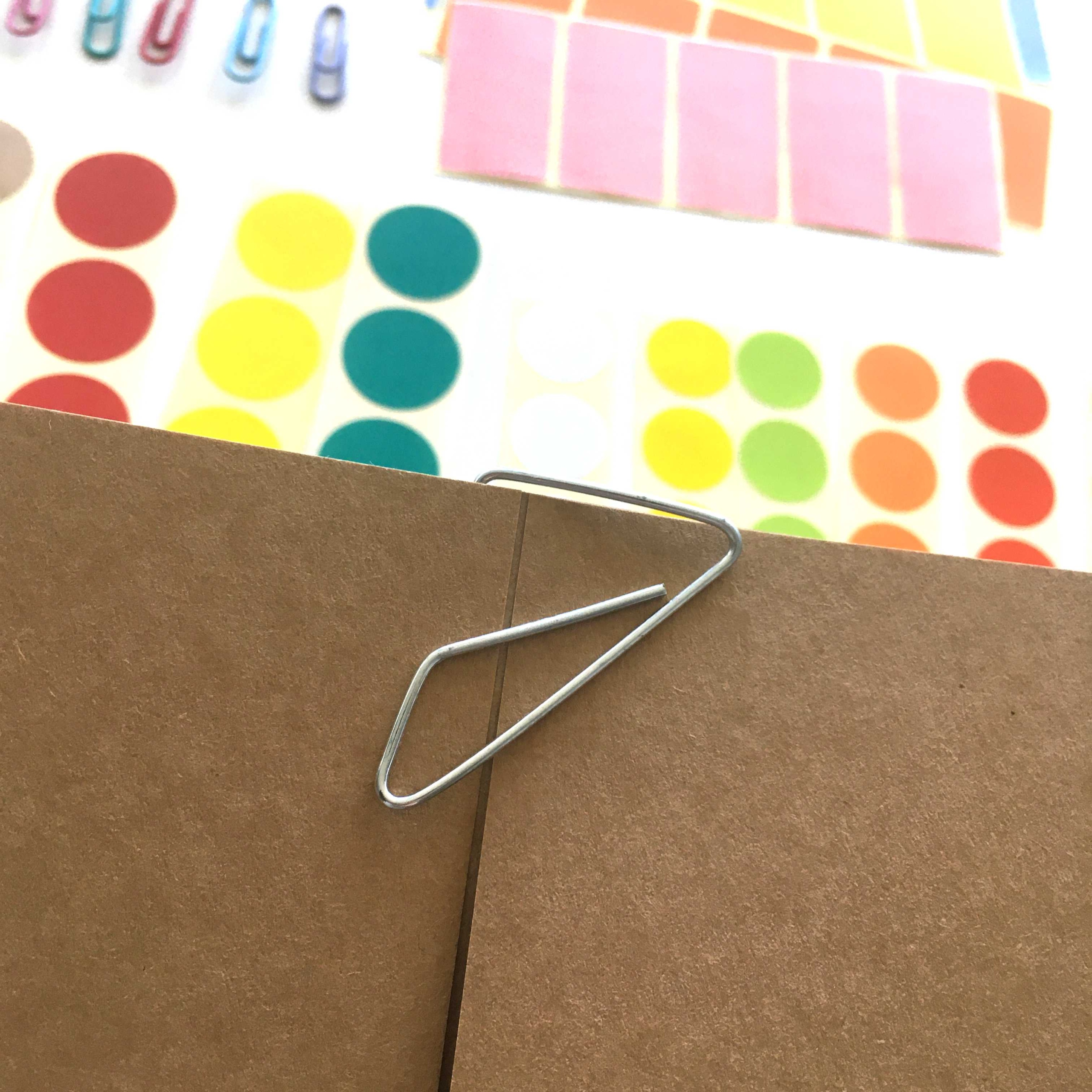 5 kolorowych spinaczy oraz 1 sztuka duży srebrny spinacz - jak na zdjęciu - do papieru, które mogą służyć do zapięcia lapbooka