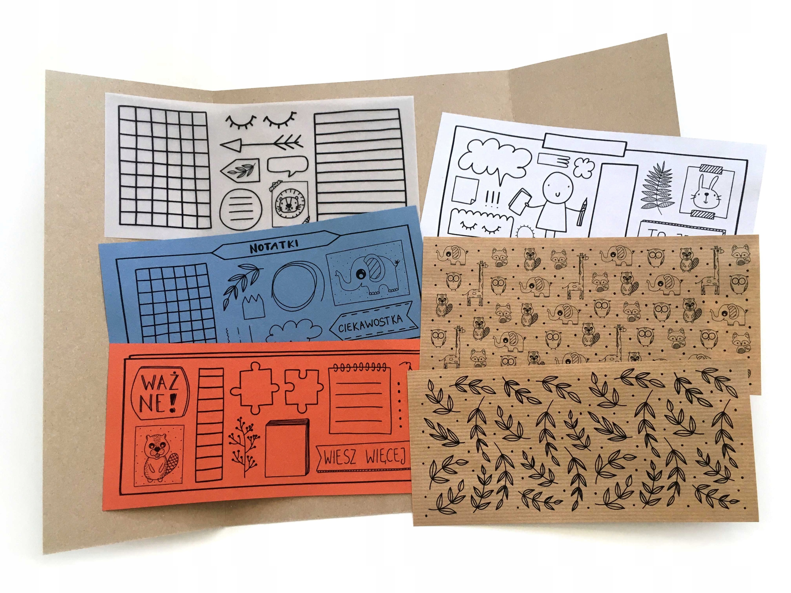 6 arkuszy z szablonami idealnie nadające się do przygotowania lapbooka - format papieru DL - papier o grubości ok. 100-170 g - jak na zdjęciu - kolorowe, papier kalka, papier eko oraz biały recykling DO SAMODZIELENGO WYCIĘCIA