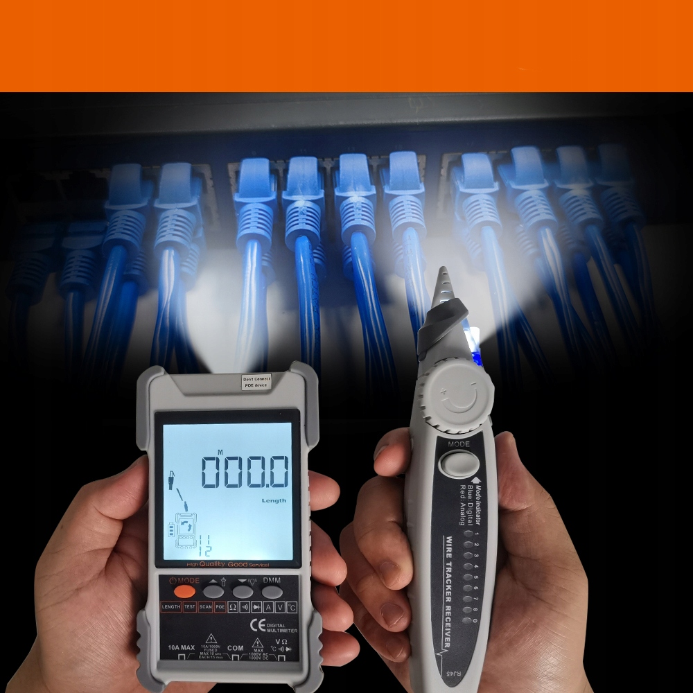 Miernik ten łączy się z funkcjami śledzenia i pomiaru długości kabla. Zaletą tego miernika jest duża odległość śledzenia wyraźny dźwięk sygnalizuje szybki i precyzyjny pomiar długości kabla. Miernik jest praktycznym narzędziem dla laboratoriów, fabryk, instalatorów sieci radiowych i techników. Może mierzyć w czasie rzeczywistym długość kabla sieciowego, zwarcie i przerwę w obwodzie. Funkcja śledzenia kabli może szybko i skutecznie znaleźć docelowy kabel w dużej liczbie kabli. Funkcja ta może być wykorzystywana w systemach telefonicznych, sieciach komputerowych, kablach BNC i innych metalowych kablach sieciowych.