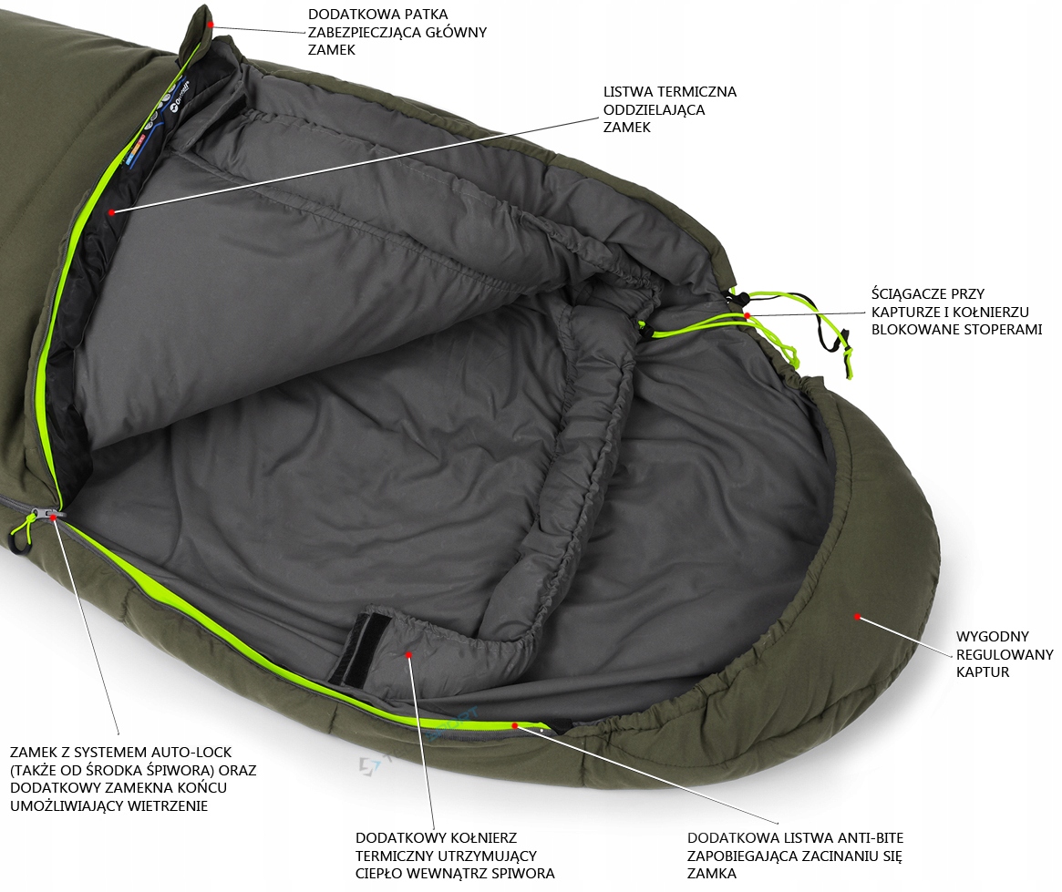 Śpiwór posiada dodatkową listwę termiczną oraz listwę Anti-Bite zapobiegającą zacinaniu się zamka. Zamek z funkcją Auto-Lock - nie rozpina się samoczynnie: