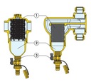 Usuwanie zgromadzonych zanieczyszczeń można przeprowadzić przy normalnej pracy instalacji, w tym celu należy otworzyć zawór (3) znajdujący się w dolnej części urządzenia. Kierunek przepływu nie ma wpływu na prawidłową pracę separatora zanieczyszczeń