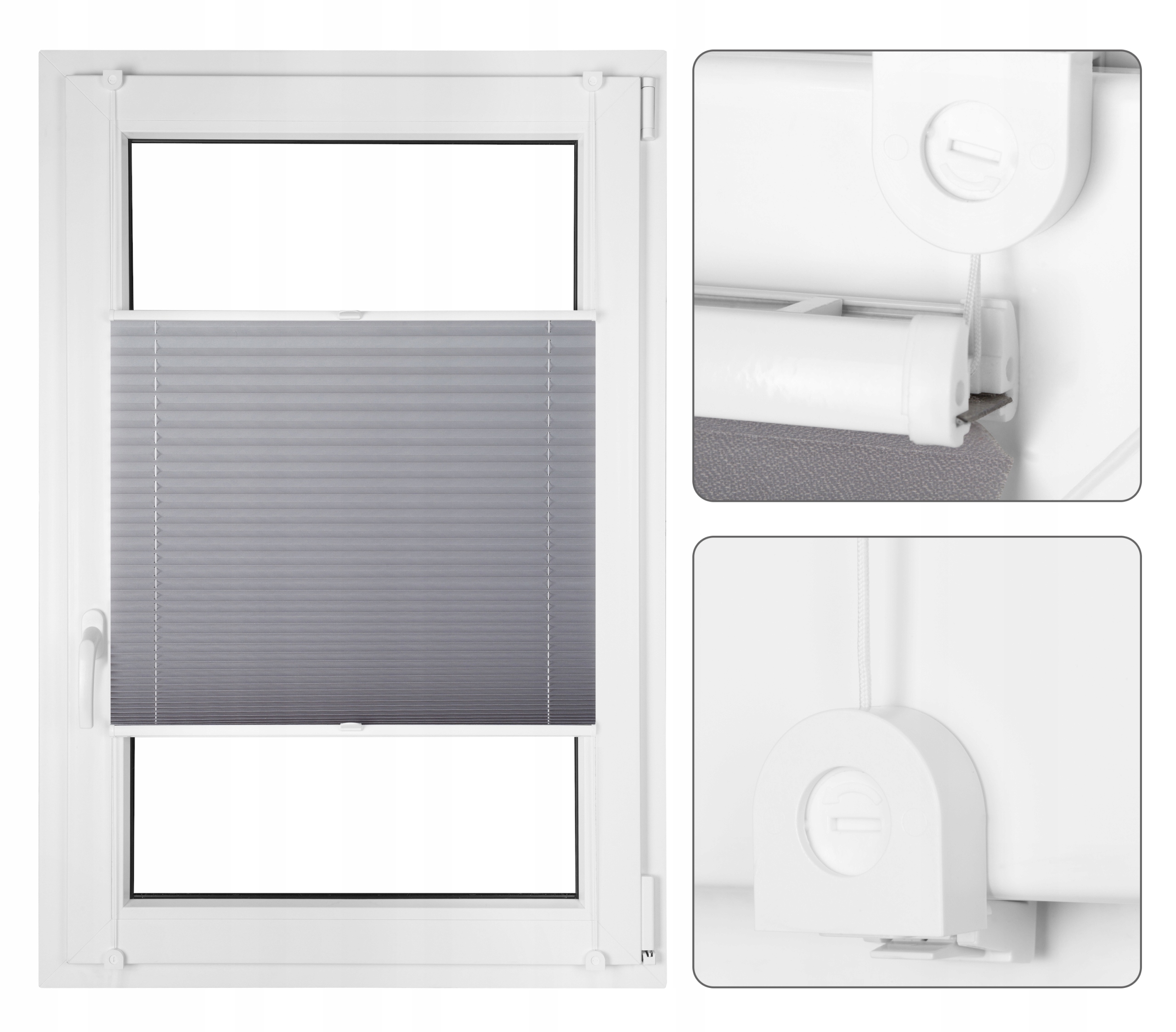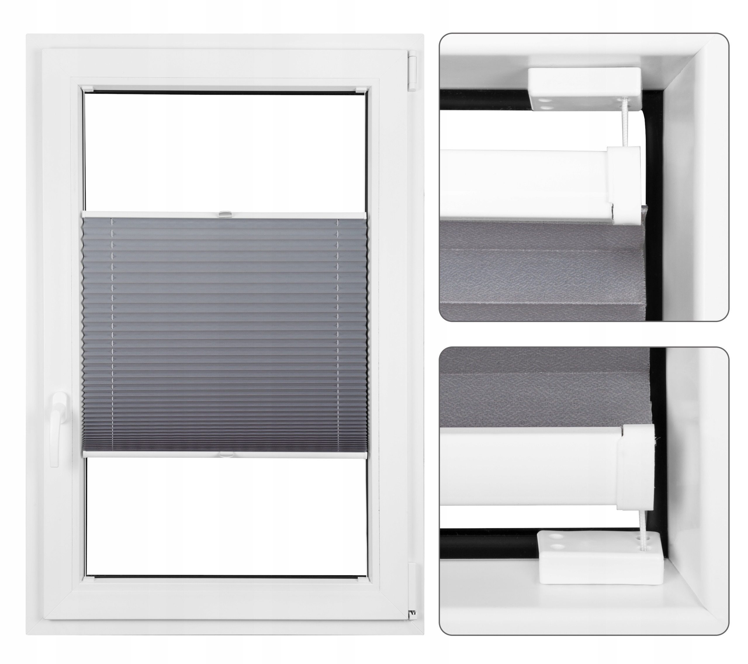 Plisa porusza się po listwie przyszybowej na ramie okiennej, zamontowana bezinwazyjnie na haczyki na górną i dolną jej część.