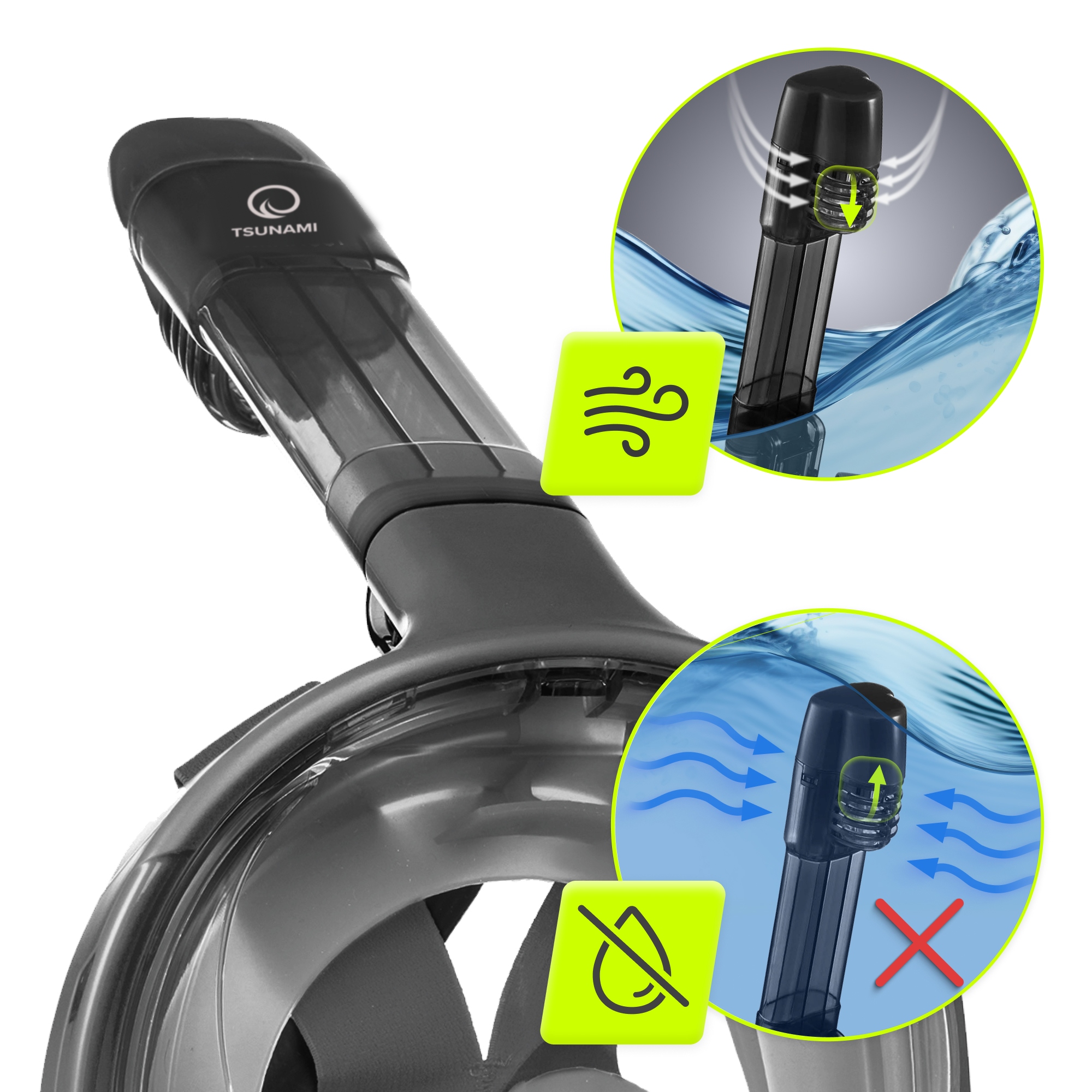 Инновационная технология DRY TOP маска для дайвинга, используемая в трубке, эффективно предотвращает попадание воды внутрь маски. Специальная конструкция трубки, оснащенная шариком, позволяет свободно дышать во время подводного плавания. В тот момент, когда дайвер полностью погружается, тогда мяч автоматически он блокирует отверстие в трубе, тем самым предотвращая попадание воды внутрь. Благодаря этому риск захлебнуться водой минимален, что повышает комфорт и безопасность при погружении.