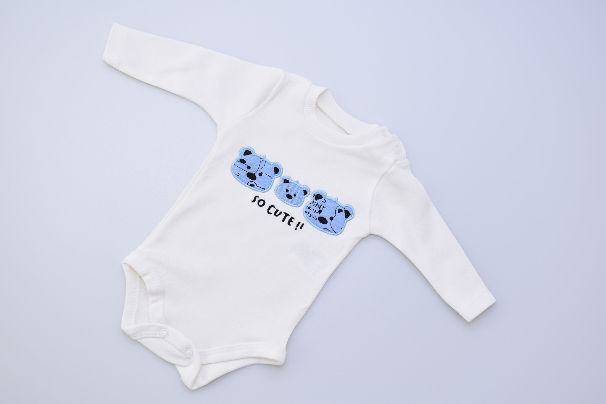 ✅ Kremowe body z długim rękawem, zapinane na zatrzaski na ramieniu. Na przodzie znajdują się naszyte 3 głowy misiów i wyszyty napis SO CUTE !!